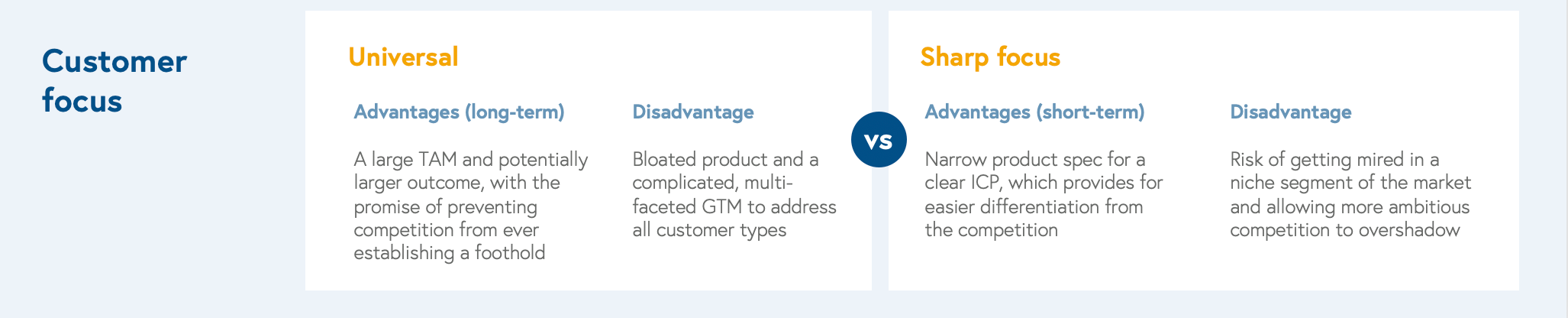Customer focus enables a startup to better define the product and build the appropriate GTM strategy for that customer segment. There are various ways to narrow focus including customer size by revenue or headcount, by industry vertical or geography. In other instances, focus may involve targeting customers with a certain technology stack or customers with a specific buyer/user persona. The product should be tailored to your ideal customer profile (ICP), but relevant to those outside of that ICP profile. At the same time, you should also have a good sense of the types of customers you will not focus on or sell to.