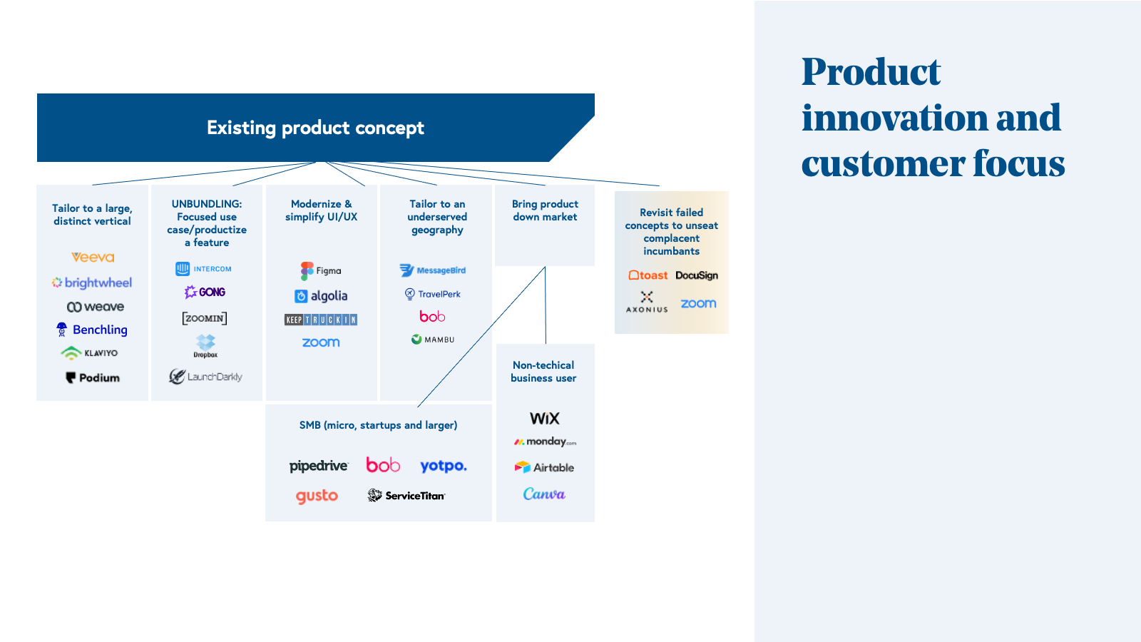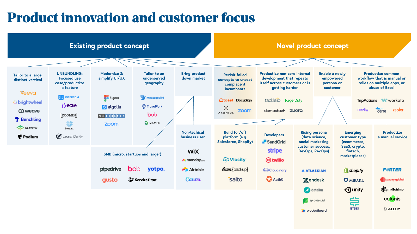 Startups can find a wedge by modernizing a clunky user experience , productizing a key feature in a bloated product, or combining core functionality from different products that saves customers time and money (e.g. Dropbox, Wix*, Canva). Other startups choose to focus on a neglected subset of customers, especially those with unique or diverging requirements including specific industry verticals (e.g. Veeva, Klavyio) or geographies (e.g. TravelPerk, MessageBird). And yet other founders find a way to build a product that is more appropriate for SMB customers and better suited for a high velocity, low-touch sales model (e.g. Pipedrive, Yotpo*, Intercom). Of course, even modest product innovations can beat the competition head-on provided it is combined with innovative go-to-market innovations (e.g. Zoom, TeamViewer*).