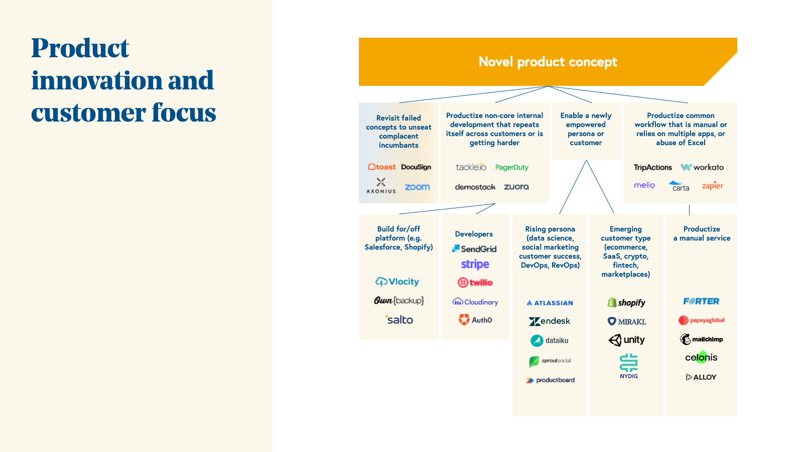 Of course, some of the examples in the charts above are companies whose products could be placed in more than one category. (Recall that this is a framework for brainstorming new ideas, not a taxonomy for established businesses.) It should be noted that some plans start as novel and back into more established product categories as they grow. Other plans start in an existing category but introduce enough innovation over time to effectively create a new product category (e.g. Twilio*). Regardless of what you choose there will always be tension between building a product that you believe in and solving a customer pain point as I’ve detailed in the product-market journey.