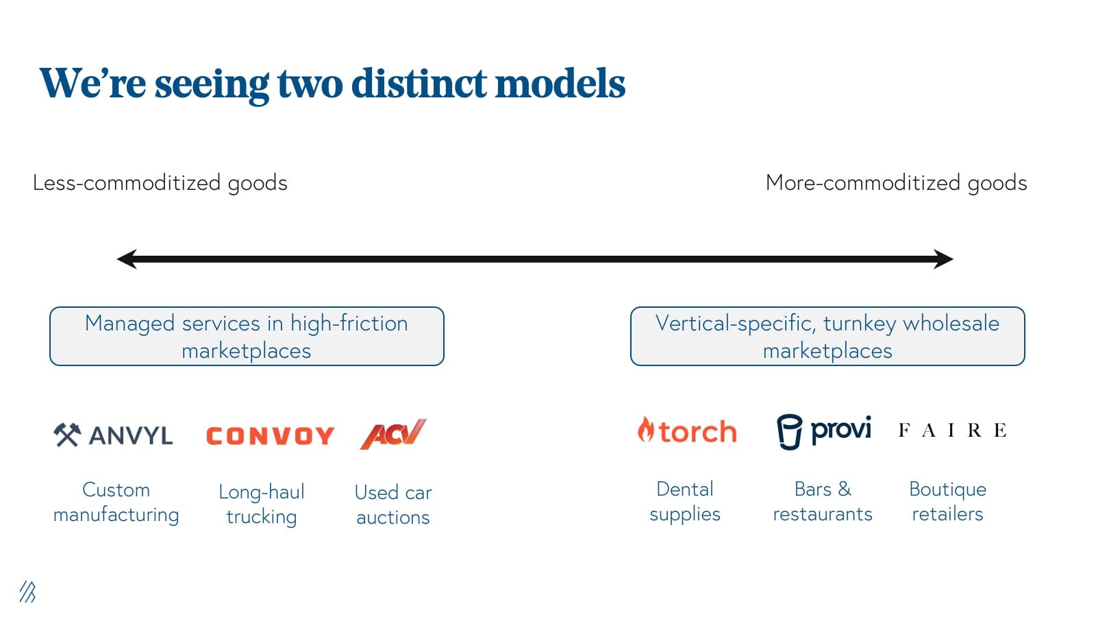 But one size does not fit all. While all of the industries in the graphic above are massive and largely offline, they have very different value chain dynamics and thus require very different approaches. At our summit, for example, we unpacked why Flexport (freight forwarding) and Provi (wholesale alcohol) have very different go-to-market and monetization strategies.