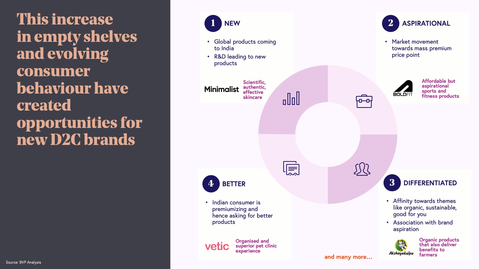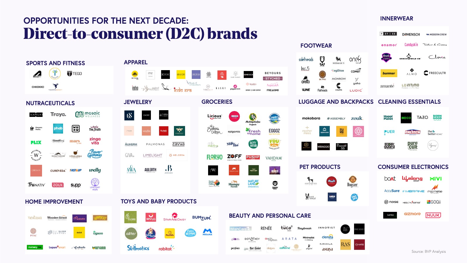 This democratization of distribution has been accompanied by a marked change in consumer preferences with a demand for newer, better priced, more aspirational, and higher quality products. Entrepreneurs have grabbed this opportunity with a proliferation of brands across virtually every category. Be it Boldfit or Blissclub in sports and fitness, Mokobara or Uppercase in travel, Snitch or NEWME in fast fashion, Lifelong or Nuuk in appliances, Minimalist, Innovist, or Deconstruct in beauty, Nestasia or Indus Valley in home and living, Comet, Neeman’s or Yoho in footwear—the list is endless.