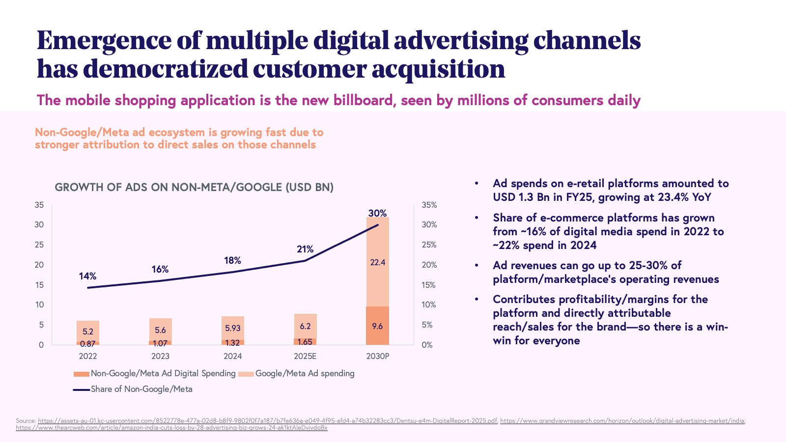 To add to the mix, similar to what we saw with e-commerce, verticalized q-commerce is emerging as a challenger to horizontal q-commerce with startups like Snabbit, Swish, and Slikk. While questions remain over the eventual profitability of this channel, consumer behavior has definitely evolved and when that happens, profits often follow, albeit with a lag. We believe ad spends could be a key factor in determining when and in what quantity these profits arrive. Digital advertising spend - long considered a duopoly between Google and Meta - has seen the emergence of retail media as a key third player. This not only allows e-commerce and q-commerce platforms to get a high margin source of revenue (brands may end up spending as much as 25-30% of sales as ads), but it also creates a more level playing field for new brands to get visibility in an otherwise crowded market landscape.
