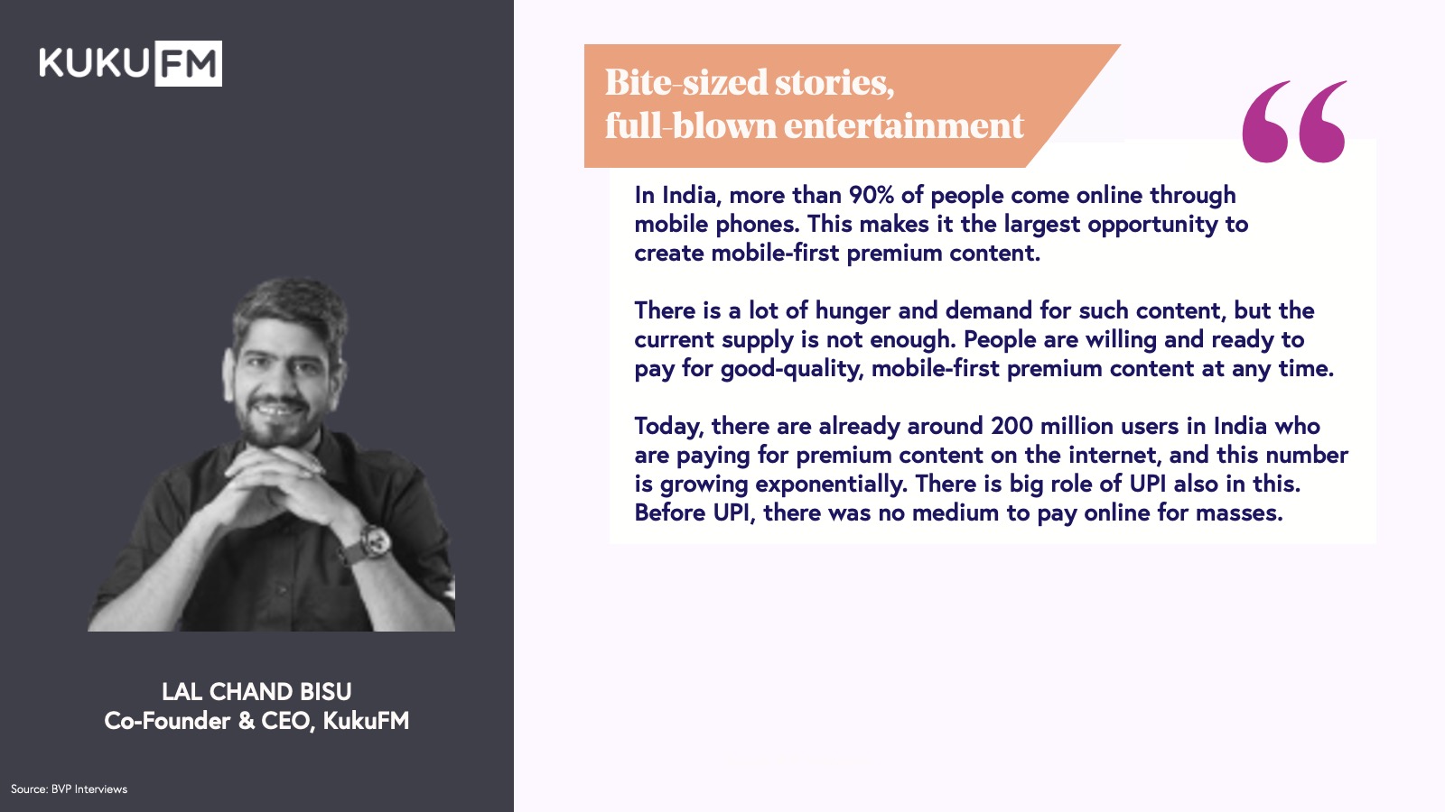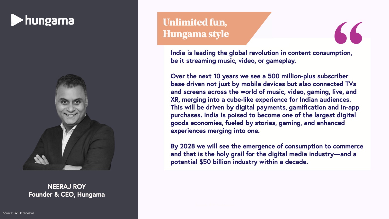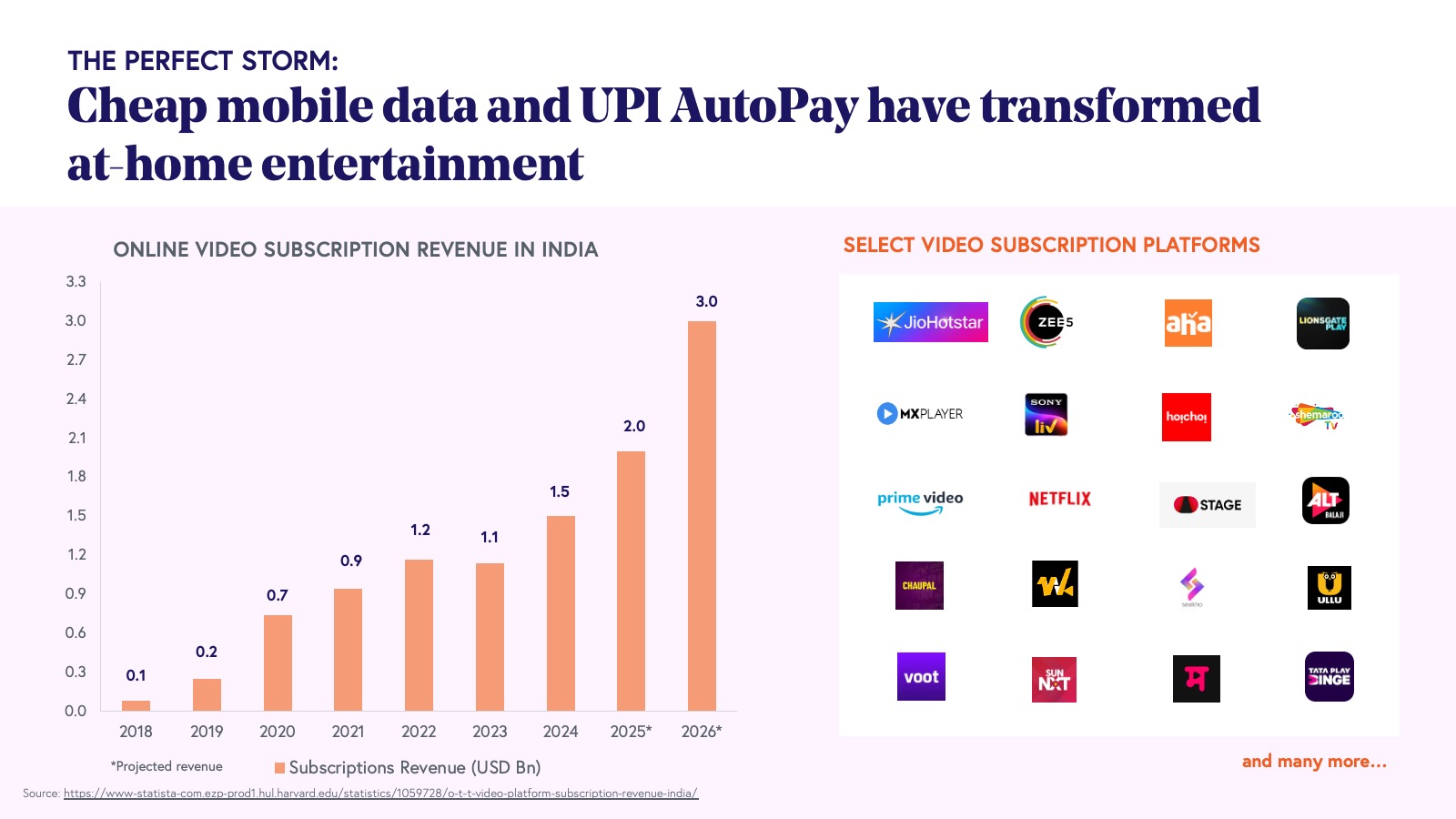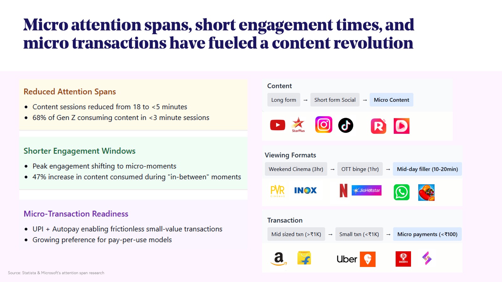India is experiencing a content revolution driven by consumers' diverse appetites for entertainment, education, and gaming. Characterized by short attention spans and a multitude of accessible platforms across interests, languages, and budgets, user engagement is rapid, facilitated by frictionless microtransactions or subscriptions on autopay.