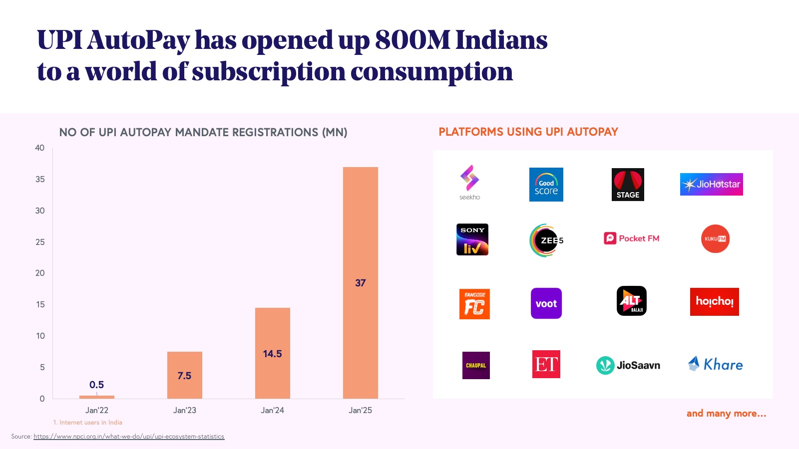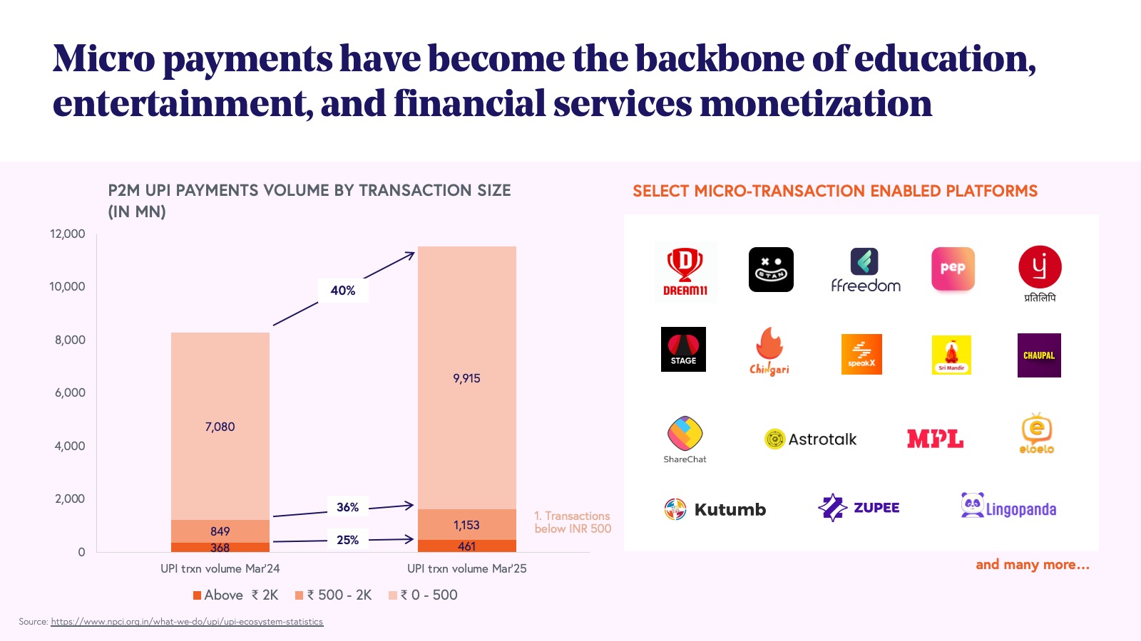 UPI autopay has also significantly boosted the content value proposition by enabling the 800 million internet users in India to participate in subscription or pay-as-you-go models. This surge has led to the emergence of content platforms in various formats and regional languages, spanning entertainment and education. Companies like KukuFM in audio, Seekho in education, Clarity in mental health, SpeakX in education, and Stage in dialect-based entertainment are capitalizing on this trend, with further expansion expected in areas like micro-drama, digital wellness, and gaming.