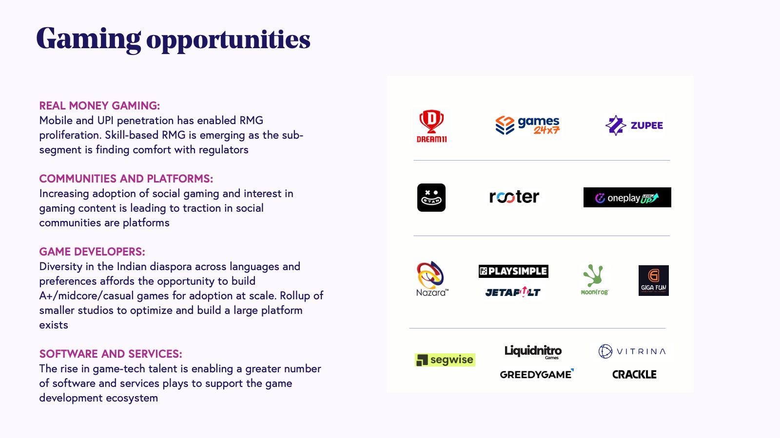 In addition to content, as India’s middle class has prioritized entertainment with their disposable income (and time), gaming has been a beneficiary, with the country’s total gaming market growing from $1.9 billion in 2018 to $3.1 billion in 2023 and projected to reach $7.5 billion by 2028. This is largely due to in-app purchases, with local and global companies alike growing the ecosystem. Ease of micropayments has helped fast-track this adoption as well. From real-money games, social games, and e-sports to software and services, the entire segment is gaining traction.