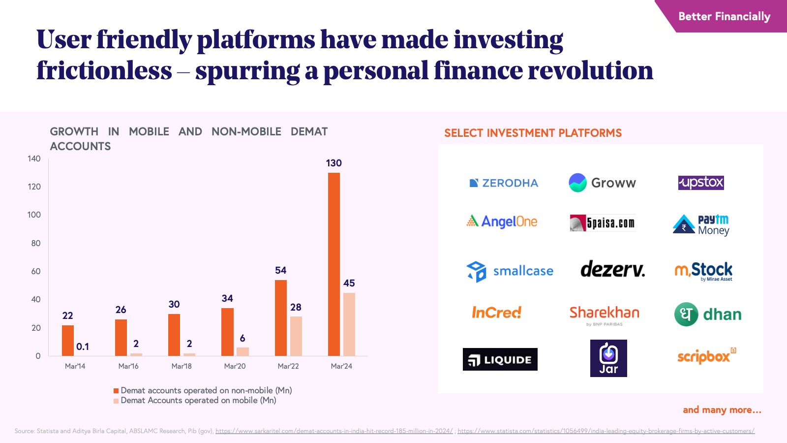 A young, aspirational India is now demanding intuitive, personalized financial services. This revolution extends naturally into wealth creation. Almost 8 million new consumers are expected to enter the wealth industry on the back of digital and mobile-led financial distribution between 2022 and 2025. The surge in demat accounts (“dematerialized;” i.e., digital accounts holding financial securities), driven by seamless digital onboarding and user-friendly trading apps, signals a new wave of retail investor participation. Platforms like Zerodha, Groww, Dezerv, and Angel One have led the charge, onboarding millions of new investors from smaller towns and cities - underscoring the demand for low-cost, mobile-first investment experiences.