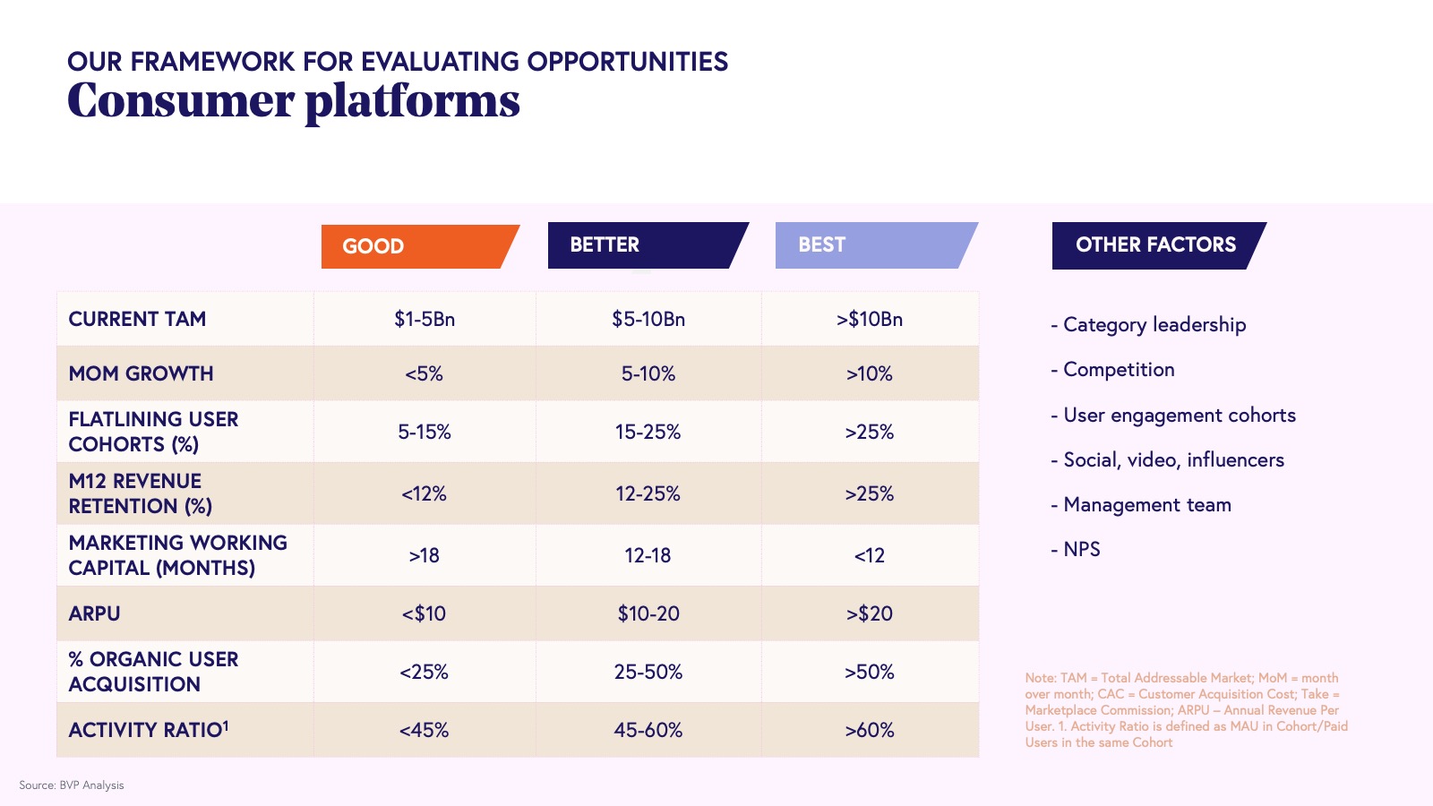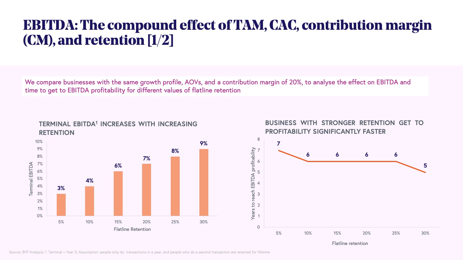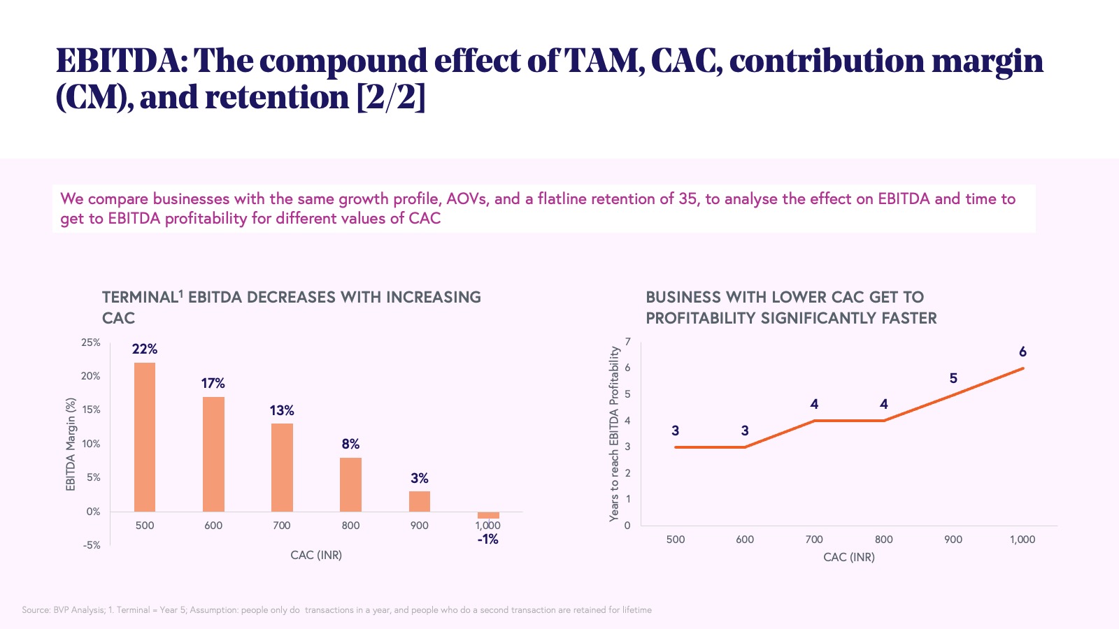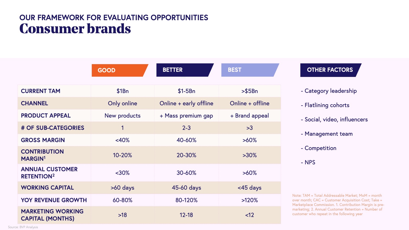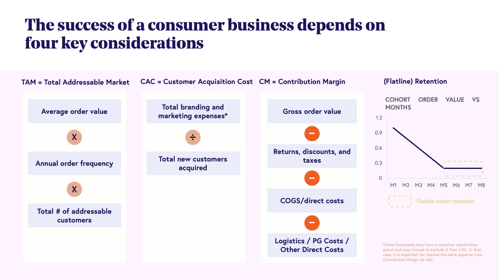 5. Building sustainable consumer businesses will depend on four core metrics: TAM, CAC, CM, and flatline retention.