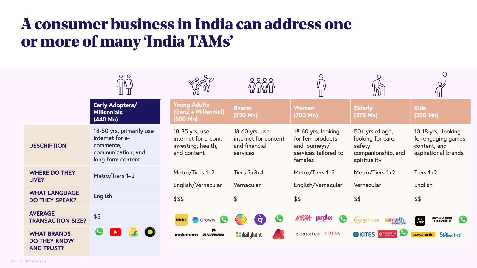 With 1.48 billion people, it is easy (and often correct!) to assume that most markets in India are large. However, there are many Indias within India and the true opportunity size for a business is shaped by the utility of its offering, its pricing, positioning, and its choice of channel. More simply put, a business’ TAM depends on a specific Indian persona, how many such people exist, how much they will pay, and how many times in a year they will pay.