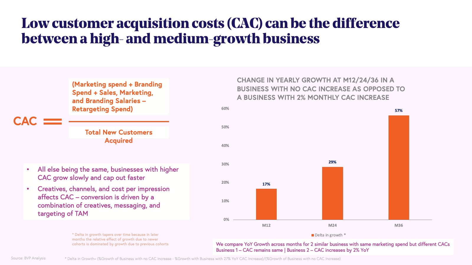 Our sample analysis demonstrates that even a modest 2% month-over-month increase in CAC can materially impact a business’s growth trajectory. This underscores the importance of maintaining a sharp focus on acquisition efficiency, as incremental changes in CAC can compound over time and significantly influence the scalability and long-term success of a consumer business. More importantly, as a business grows and increases market share, the number of new customers available often reduces, thereby giving rise to the adage that CAC only increases with time. We think this adage, while not always correct, does have some truth in it - that is, as you cycle through the set of customers available for your business, unless you keep upgrading your product or introducing new offerings (expanding your TAM), CAC is likely to take a hit.
