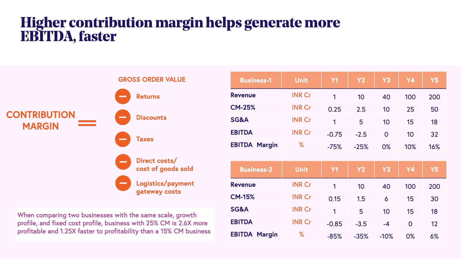 Once we have clarity on which customers are being acquired and at what cost, the next step is to analyze the value a business can capture by removing the cost of servicing these customers. Specifically, it is necessary to determine the dollar contribution from each order after accounting for all the variable costs associated with fulfilling that order. This contribution margin, calculated as net sales revenue minus variable costs, is a critical metric for understanding the unit economics of a business. Contribution margin serves as a foundational driver of earnings before interest, taxes, depreciation, and amortization (EBITDA) at scale, as it reflects the portion of revenue available to cover fixed costs and ultimately contribute to profitability.