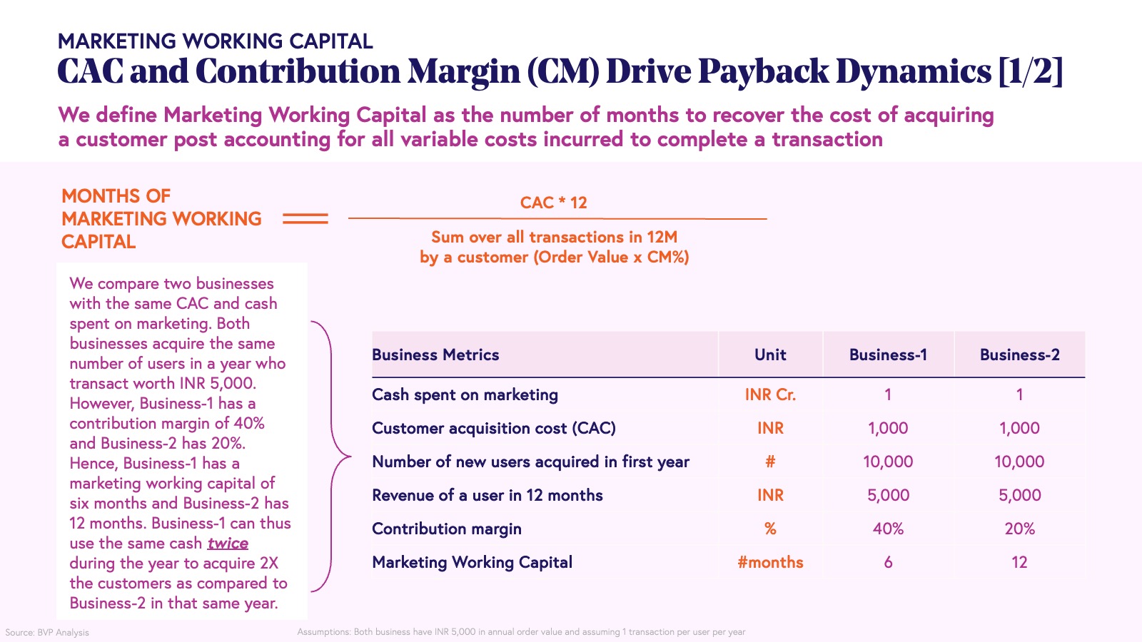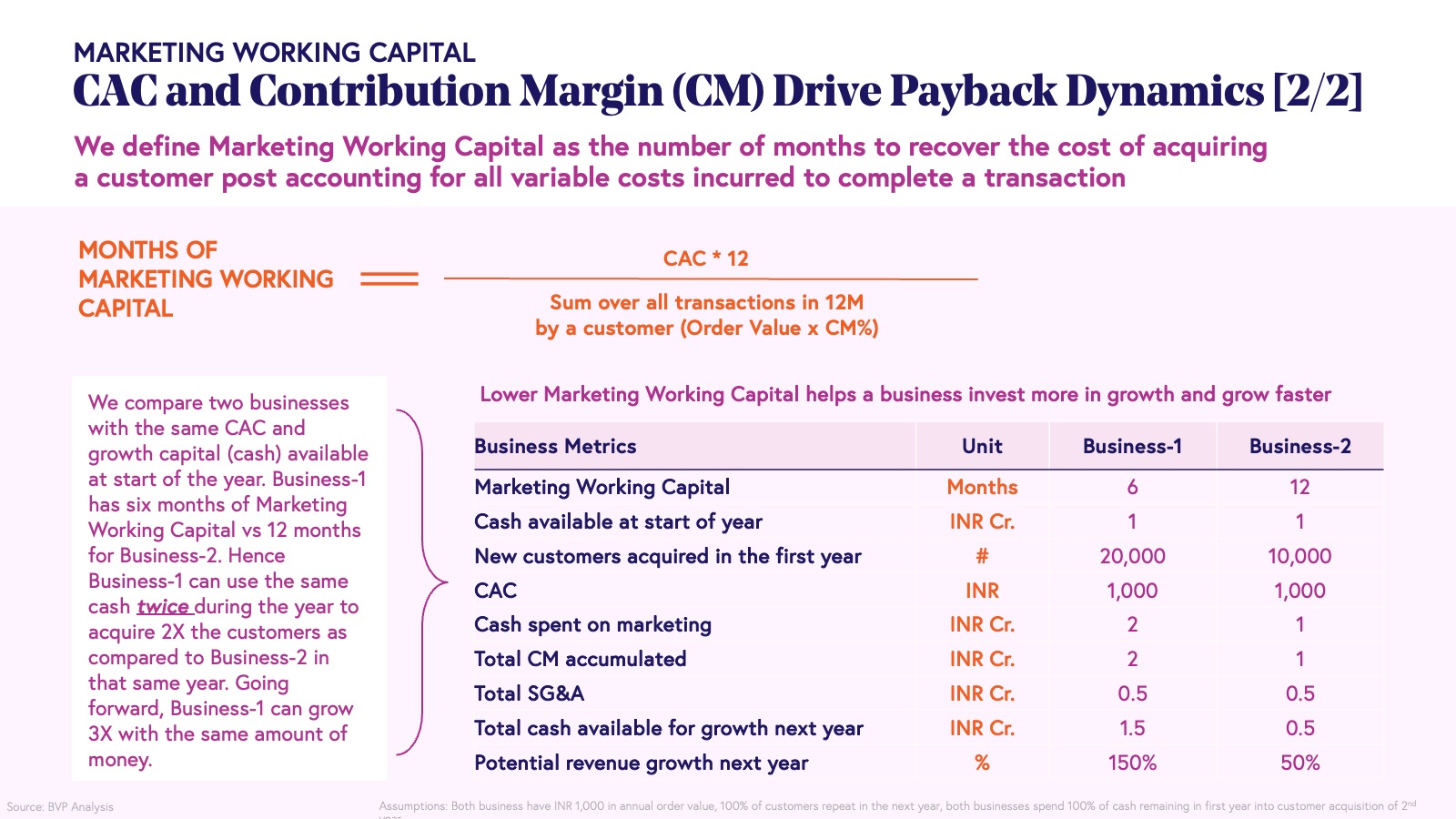 One adjacent concept to understand here is what we refer to as “Marketing Working Capital,” which is an interplay between CAC and CM. While traditional businesses have capital expenditures or upfront costs to recover, digital consumer businesses have a similar upfront expenditure in customer acquisition and brand building. Marketing Working Capital refers to the time it takes for a business to recover the contribution margin from all orders, sufficient to offset the acquisition cost incurred to bring a customer onboard. The speed at which a company can recoup its marketing spend from customer-generated cash flows directly impacts its ability to reinvest in growth and pursue other strategic initiatives.