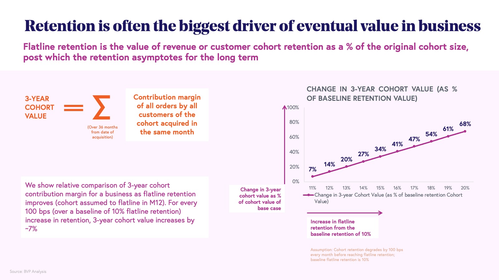 While any business may have a large TAM, customer preferences even within the TAM can vary and hence only a subset of customers will remain engaged over the long term — those who experience a strong and consistent product-need fit. Within every user cohort, the proportion of users who continue to engage with the product over time is referred to as flatline retention. This metric is fundamental to assessing the long-term outlook and profitability of a business, as these retained users tend to contribute disproportionately to the contribution margin over their lifetime. All else being equal, a business with 20% flatline cohort retention will realize a significantly higher three-year cohort value compared to one with just 10% cohort retention.