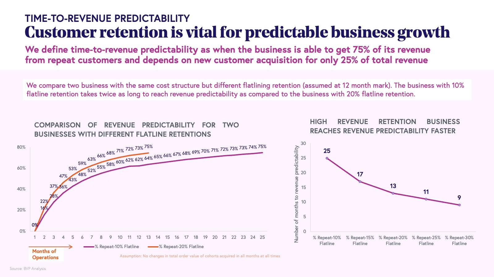 To illustrate the impact, consider two businesses with identical marketing spends, average order values, and customer acquisition costs. If one business improves its retention rate from 10% to 20%, it can reach revenue predictability as much as 12 months sooner than the other. This demonstrates how even incremental gains in retention can materially accelerate the path to stable, predictable revenue and, ultimately, sustainable growth.