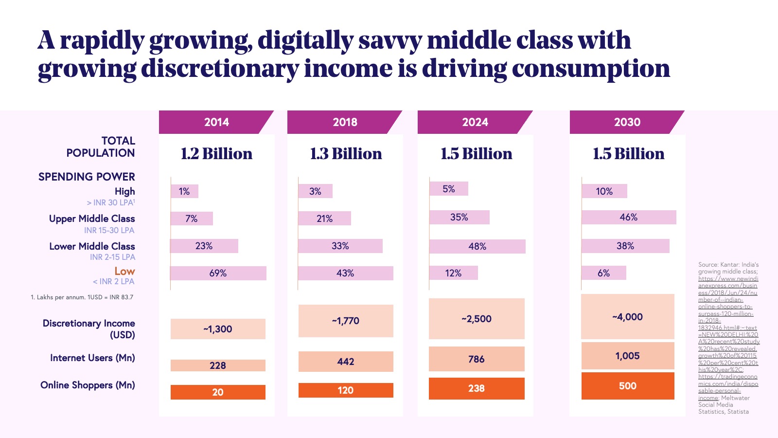 Second, India's demographic shifts are significant. As the world's most populous nation in 2023 (1.48 billion) with a young median age (28.8 years), its per capita discretionary income has doubled to roughly $2,500 in 2024 and is expected to hit $4,000 by 2030, fueling retail growth. It is also interesting to note that a large proportion of India’s young consumer base was born with a smartphone in their hand, with no knowledge of an offline world.