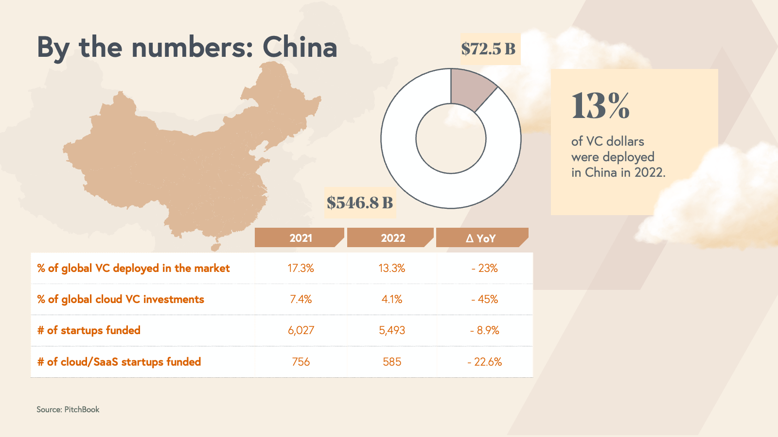 In 2022, 13% of all VC dollars were deployed in China, making up $72.5 billion. Venture capital investors funded 5,493 Chinese startups last year, 585 of which (11%) are cloud or SaaS businesses.