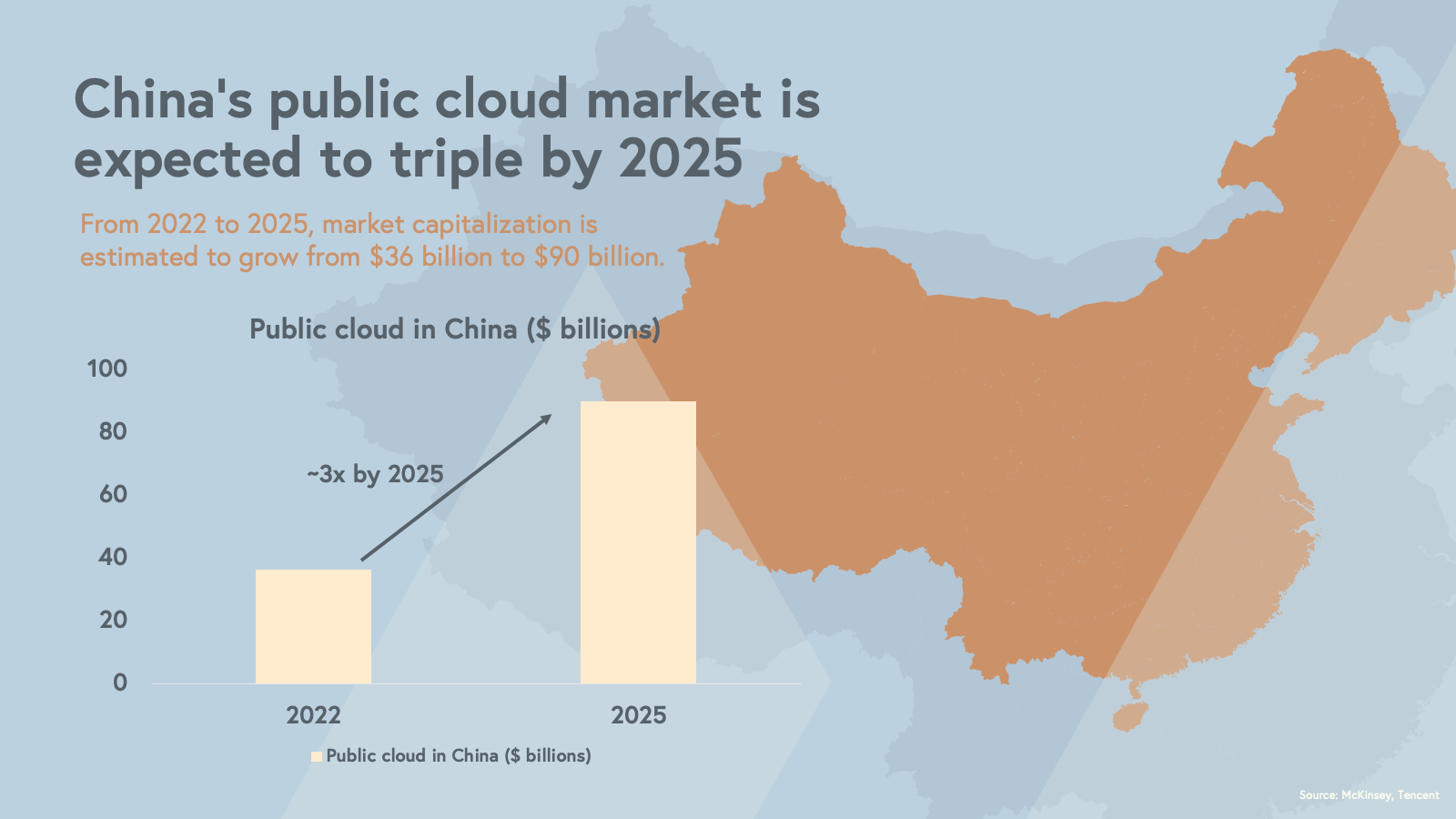 Though pandemic-era lockdowns have hindered enterprise sales teams from being able to travel, China’s cloud market is still growing: it’s expected to nearly triple over the next three years, from $36 billion in 2022 to $90 billion by 2025.