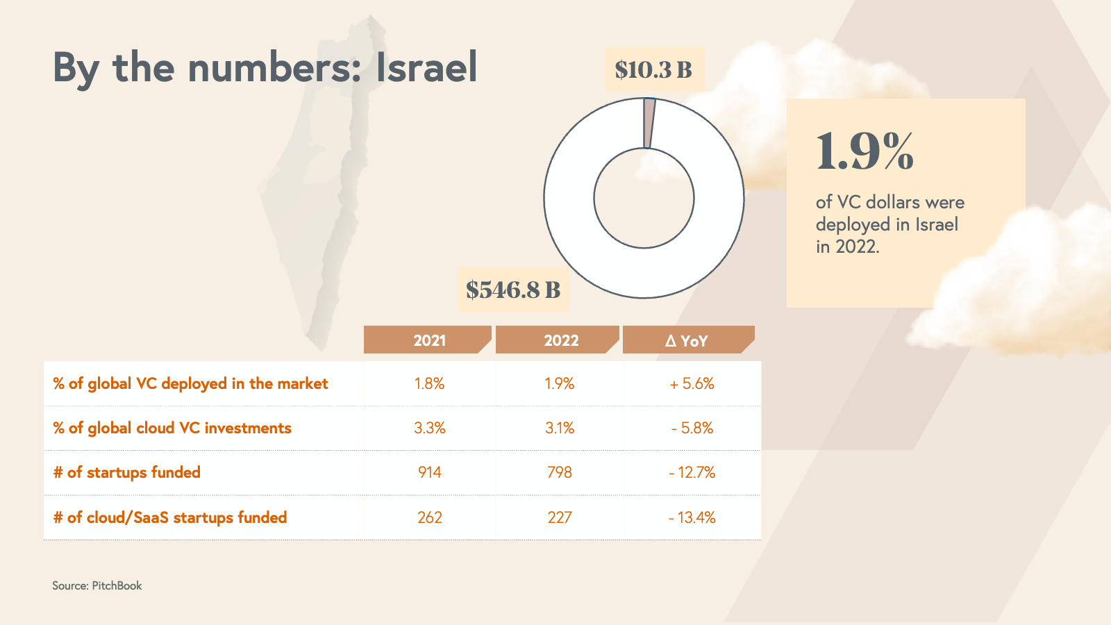 The Israeli cloud market is distinct in its scale for such a small country, representing just .12% of the world’s population. Last year, almost 2% of all VC dollars were deployed in Israel, totaling $10.3 billion. That’s nearly as many VC dollars as all of Latin America, including Mexico.