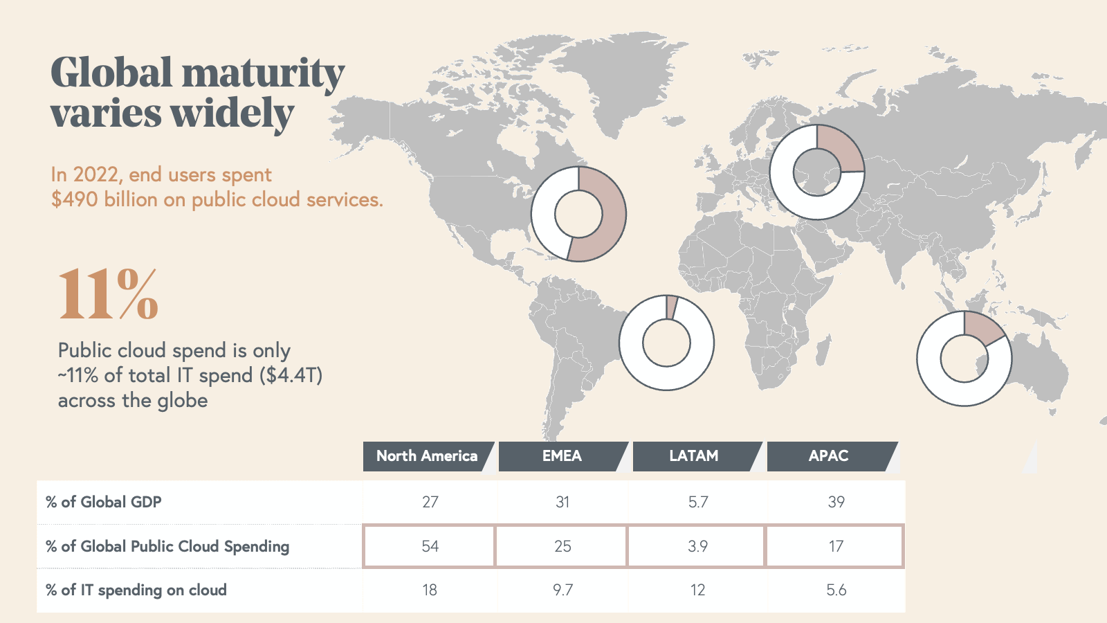 When we look at different markets across the globe, there are still growing opportunities for cloud adoption and entrepreneurship across Israel, China, India, and Europe. Cloud spending grew 85% in Latin America, including Mexico (LATAM), and 35% in Asia and the Pacific (APAC). Venture capital investors deployed $53 billion into cloud companies outside the United States and Canada last year, or 42% of global cloud VC investing. And cloud and SaaS deals represented nearly a quarter of worldwide venture-backed startups last year.