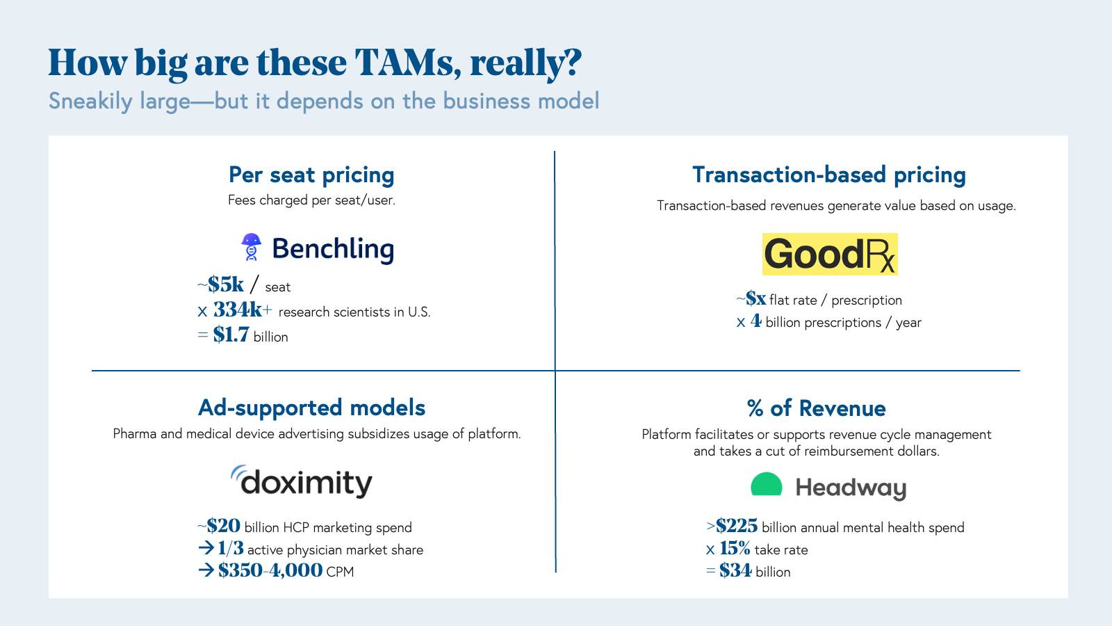 Impressive at a glance, the true TAMs for product-led health tech and life sciences companies are actually quite sub segmented, unlocked by business model innovation rather than the sheer numbers of addressable users.