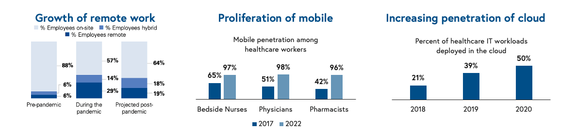 Furthermore, pandemic-fueled expansion of telemedicine, the sheer opportunity for healthcare workers to work from home has evolved, unlocking new product categories for remote professionals deployed on the cloud. Mobile penetration among healthcare workers has achieved near-ubiquity, with greater than 96-98% of clinicians leveraging mobile technology, unlocking vast new surface area for technology products.
