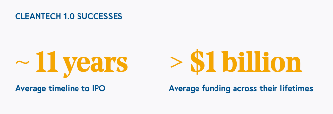 Finally, successful CleanTech 1.0 successes took an average of ~11 years to IPO, slightly above the typical time horizon of ~10 years for a traditional venture fund. Furthermore, successful companies on average needed > $1B in funding (including debt and equity) across their lifetimes.