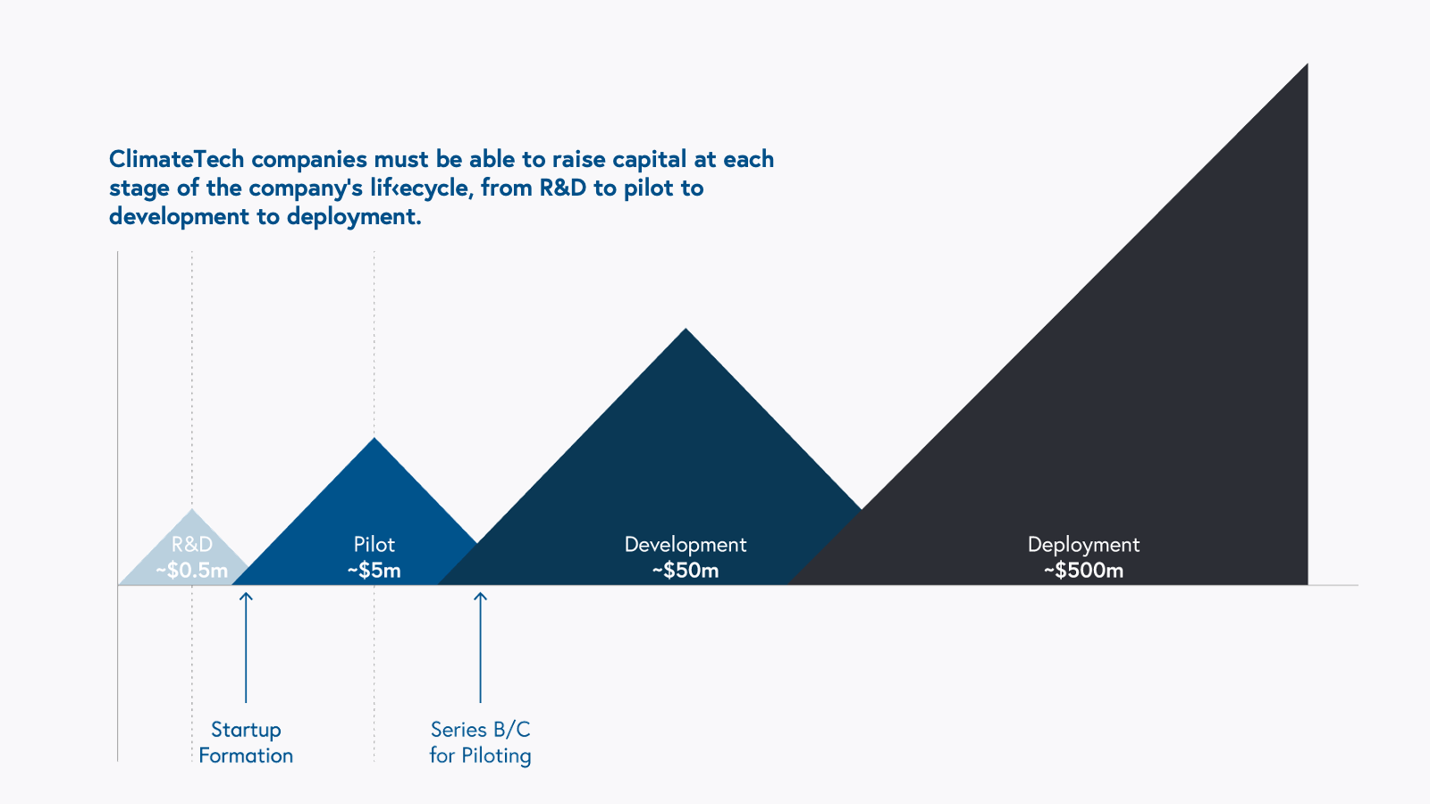 Many deep climate technologies have longer return profiles than traditional VC-backed companies. These climate companies therefore face significant financing risk and must be able to raise capital at each stage of the company’s lifecycle, from R&D to pilot to development to deployment. In the R&D phase, a company is just transitioning from the lab setting to the commercial world. In the pilot phase, a company is building its first working prototype or in trials with a few demo customers. In the development phase, a company is fully-operational in a real-world environment. Finally, in the deployment phase, a company has found a repeatable GTM motion that is being replicated at scale.
