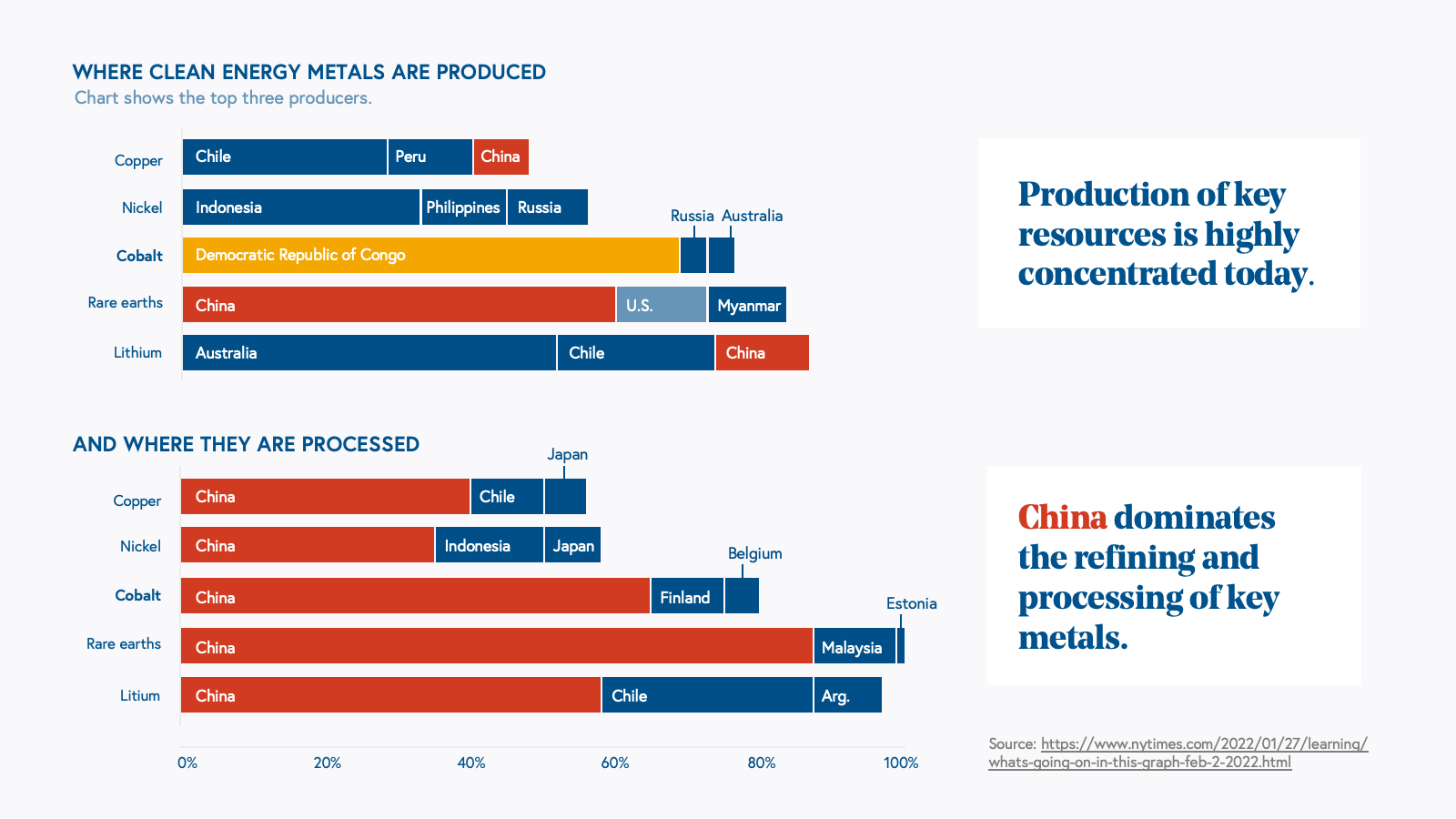 Today, we still need to be wary of companies betting their lifeblood on either the continuation (or disruption!) of supply chain trends, given the degree to which these trends are outside of a company’s control. For example, China today dominates the supply chain for rare earth metals, which are a crucial input to climate technologies like batteries. Cobalt, in particular, is essential to improving the stability of lithium ion batteries, but about 85% of the world’s cobalt supply used in batteries has been processed in Chinese refineries.