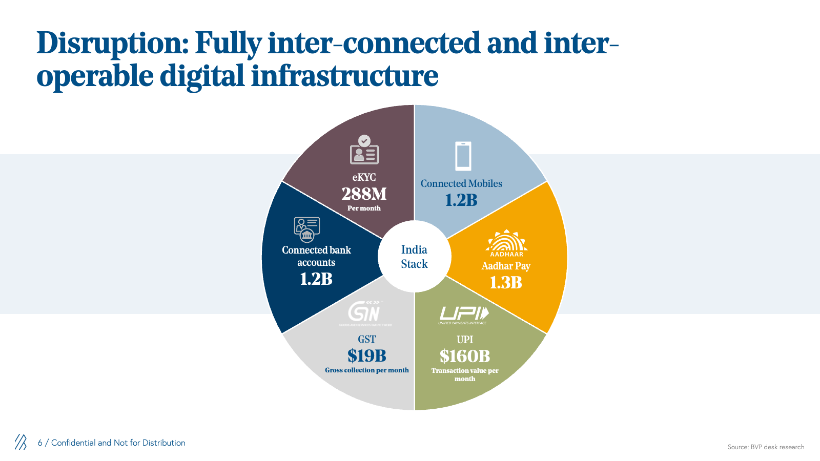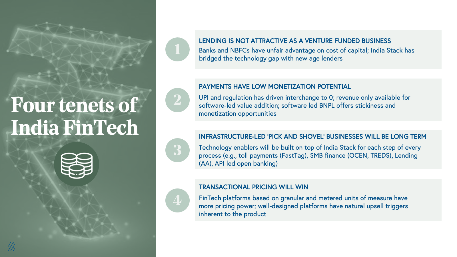 - Infrastructure-led 'pick and shovel' businesses will be long-term. We realized that the cost of capital and regulations would eventually favor large banks, NBFCs, and insurers. Software businesses must have an ability to play across all banks, non-banks, new age lenders, and insurers via a pick-and-shovel play and a strong winner-take-all dynamic, which can lead to outsized outcomes. We’re also expecting infrastructure innovation to catalyze growth, with technology enabling every financial process. While the government led most of the current financial stack efforts, in the coming years we envision more private sector leadership in building newer API-led infrastructure and data platforms on top of current rails, driving more adoption and improving ease -of -use across different segments of the financial services industry.