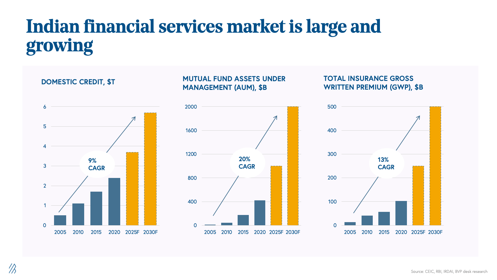 Financial services is the largest sector in the world at around 20-25% of the global economy. India is no different, with financial services constituting over 24% of the country’s market capitalization. Despite the sector’s might and scale, there still is massive scope for rapid growth across all dimensions of financial services, including credit, investments, and insurance, with the potential for billions of dollars in market capitalization to be created in each of these sub-sectors. We estimate that by 2030, domestic credit will double and become a $5.5 trillion market; mutual fund assets under management (AUM) will grow 5x from $400 billion to $2 trillion; and insurance will grow from $100 billion to $500 billion. Even then, the industry will have just scratched the surface with each of these sectors.