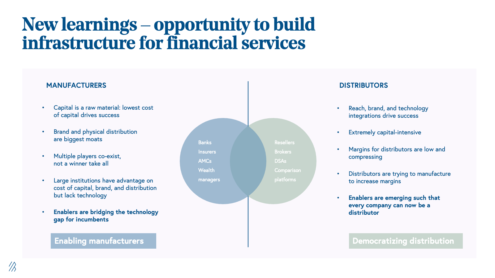 While we had a lot of success in our legacy financial services roadmap, we also came away with some key learnings which gave us pause on pursuing the same strategy any further. One learning was that existing manufacturers in the financial services industry, i.e. banks, insurers, and asset management companies (AMCs), have a sustainable advantage on cost of capital, brand, and distribution that allows them to have a long-term edge over new tech-enabled providers.