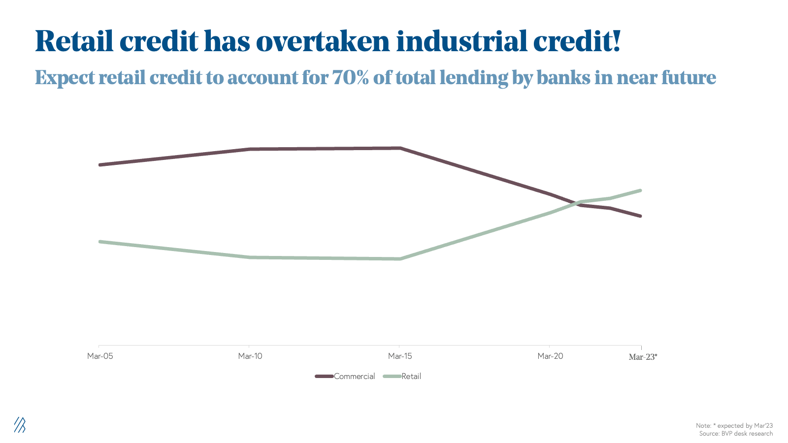 As of March 2005, banks in India had $50 billion in total outstanding retail loans, representing 7% of the country’s gross domestic product (GDP). By December 2022, the same figure had grown to $480 billion, or 15% of the GDP. For the last two decades, corporate loans represented the majority of loans in India, which peaked in 2013. Since then, retail lending has overtaken corporate lending. We believe retail loans will occupy 70% of India’s overall bank loan market in the near future.