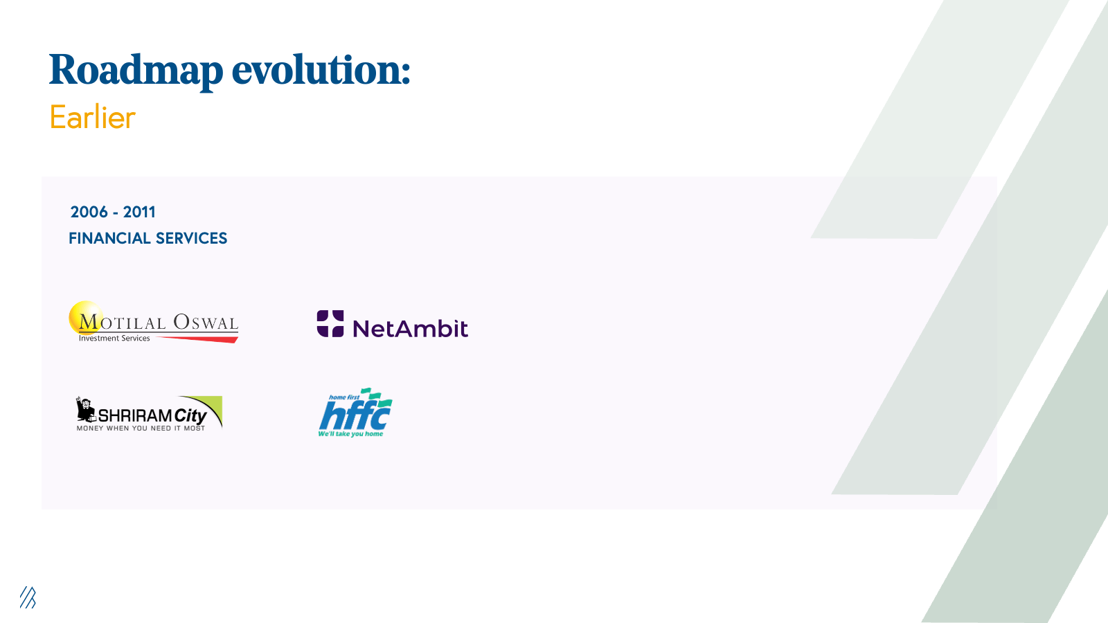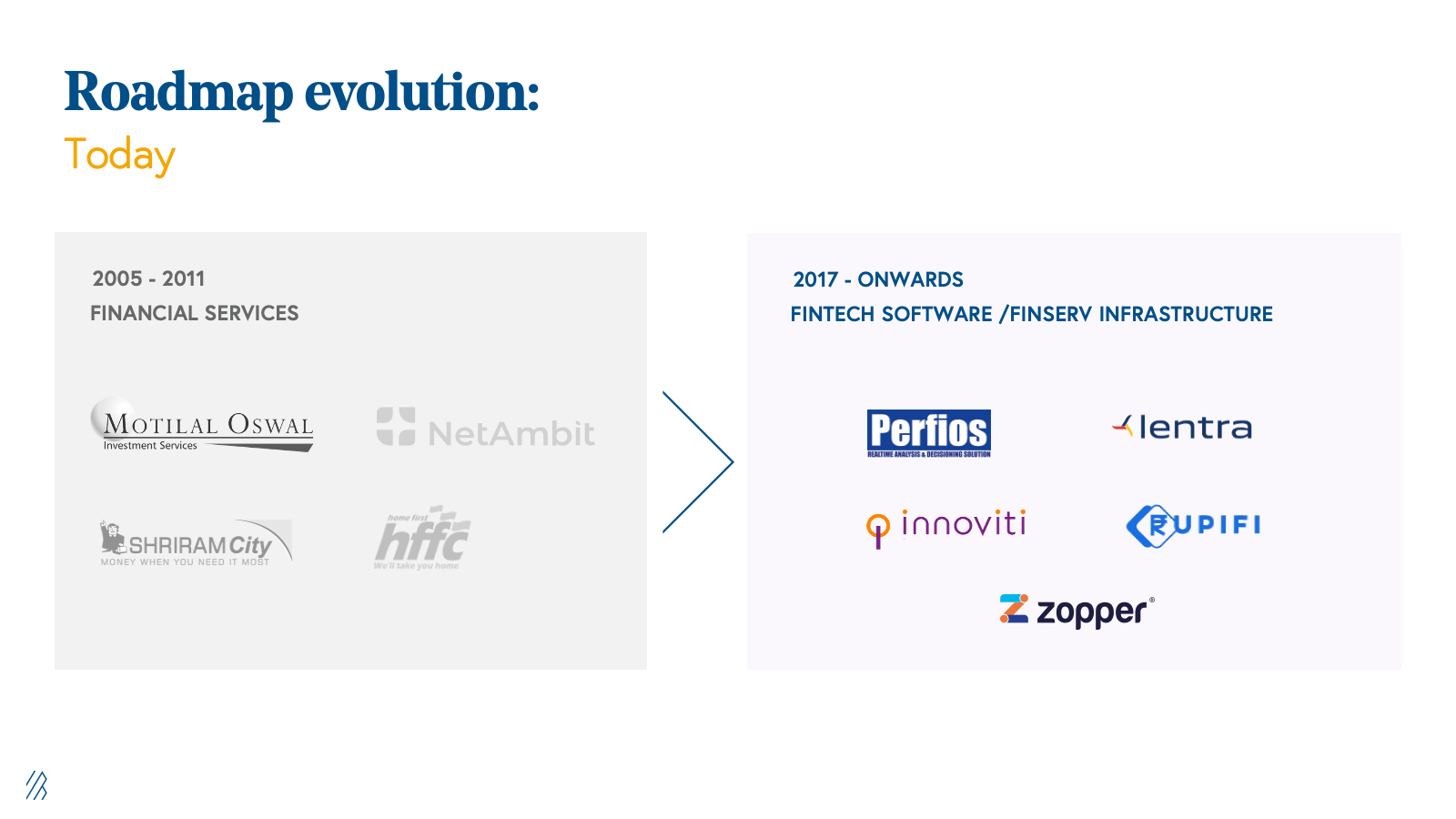 Since 2017, we have been investing in the evolved roadmap based on our learnings. We want to continue to find software opportunities in different parts of the banking and insurance lifecycle including credit, underwriting, fraud, collection, KYC, wealth management, claims, and straight-through processing (STP). We are among the few funds who have experience on both the actual lending side as well as the software enablement side and understand the nuances of both. We also benefit from our experience of investing in companies such as Perfios, Lentra, Mambu, nCino, Zopa, Bankjoy, Zopper, and Shyft, among others.