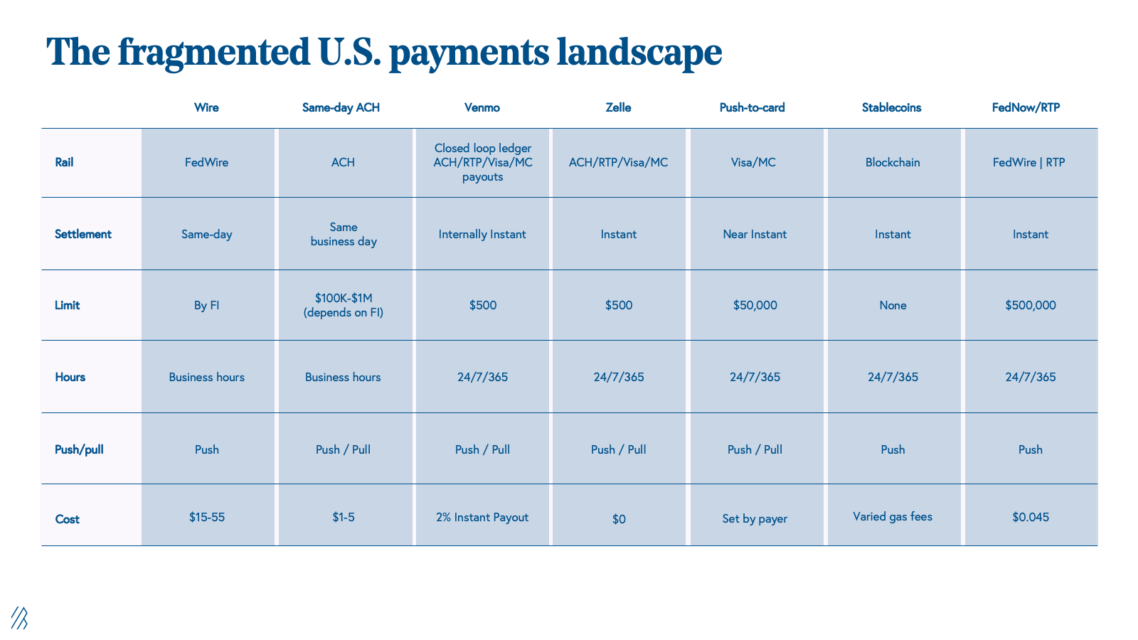FedNow’s promise of faster payments is not new. Aside from RTP and same-day ACH, we have seen faster payments in a number of forms: closed loop P2P payments (Venmo, Zelle), wire transfers, stablecoins, and push-to-card. Each varies in settlement type, rail, limit, cost, push/pull capabilities, and transaction limits. This has created an ecosystem where U.S. money movement has become unnecessarily complex.