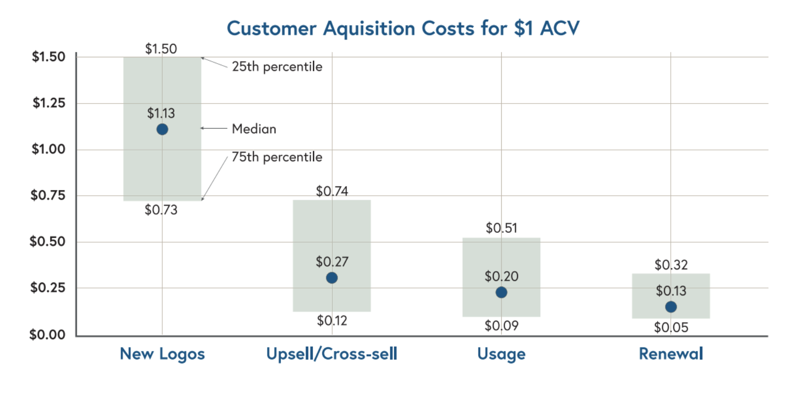 Coffee is for closers? Forget it, coffee should be for upsells and cross-sellers. After all, new logo acquisition is the most expensive way for most companies to generate revenue. It devours an average of $1.13 in customer acquisition costs for every dollar of revenue generated. Upselling and cross-selling, on the other hand, costs an average of 27 cents, according to a study of 174 SaaS companies.