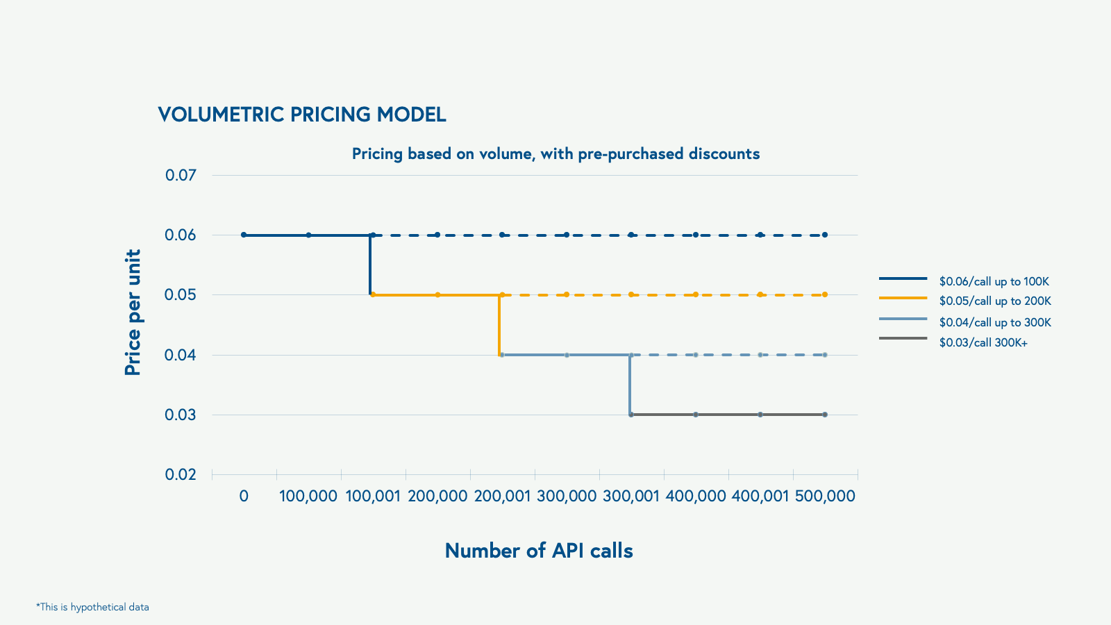 - In the hypothetical case above, the volumetric plan begins at $0.06 per API. After 100,000 APIs, the staircase discount model kicks in if a higher volume is pre-purchased (e.g. price per unit decreases with volume).