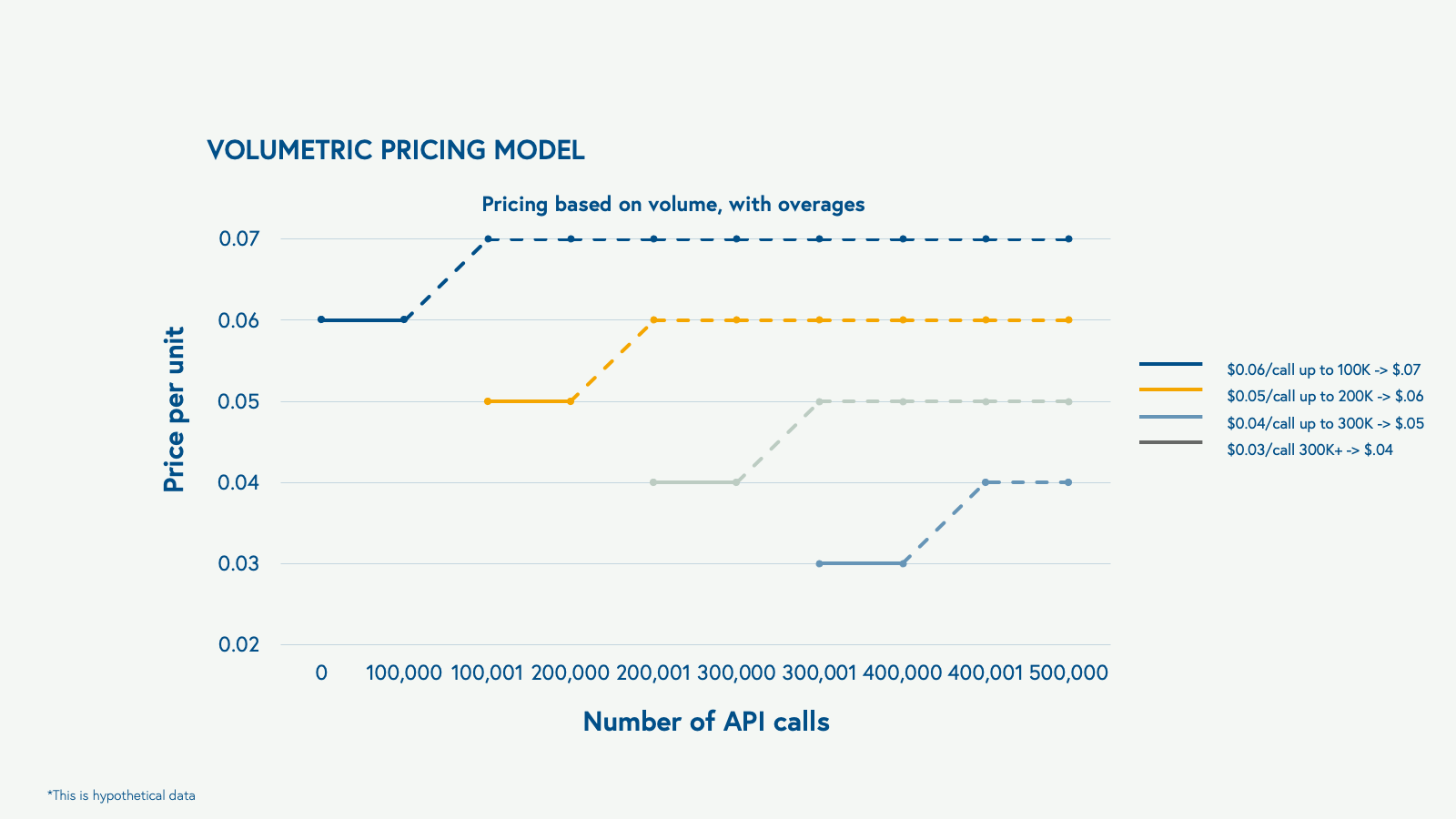 - In the hypothetical case above, the volumetric plan begins at $0.06 per API, but if a higher volume isn’t pre-purchased, the customer must pay an overage rate of $0.07 per API call (e.g. price per unit increases with volume).