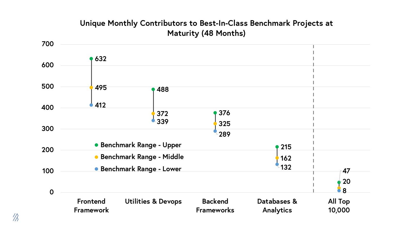 While this is far from a perfect system, we have tried to develop benchmarks that account for the variations across project types by assembling benchmark sets of the top 10 to 20 projects of all time across four major buckets (frontend, backend, devops, and databases) to help us compare projects apples-to-apples against appropriate peer groups. The chart above shows the ranges of monthly contributors for these best-in-class projects at their maturity.