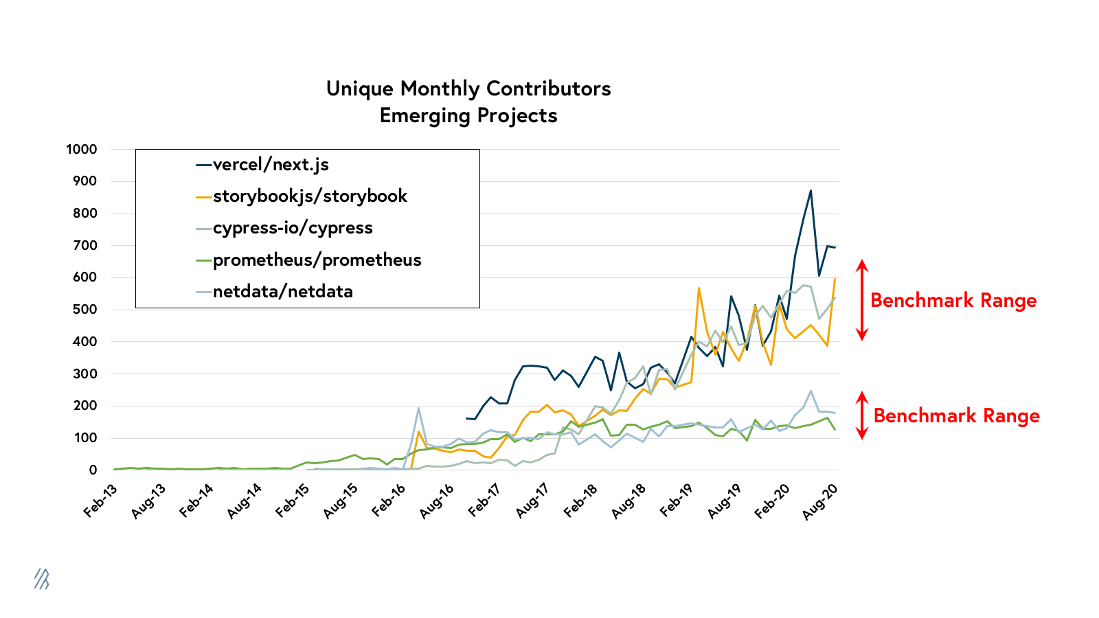 - While we do use these ranges to provide valuable context around how some of the top open source communities in each category have evolved, we do not view these benchmark ranges as hard-and-fast rules that define success.