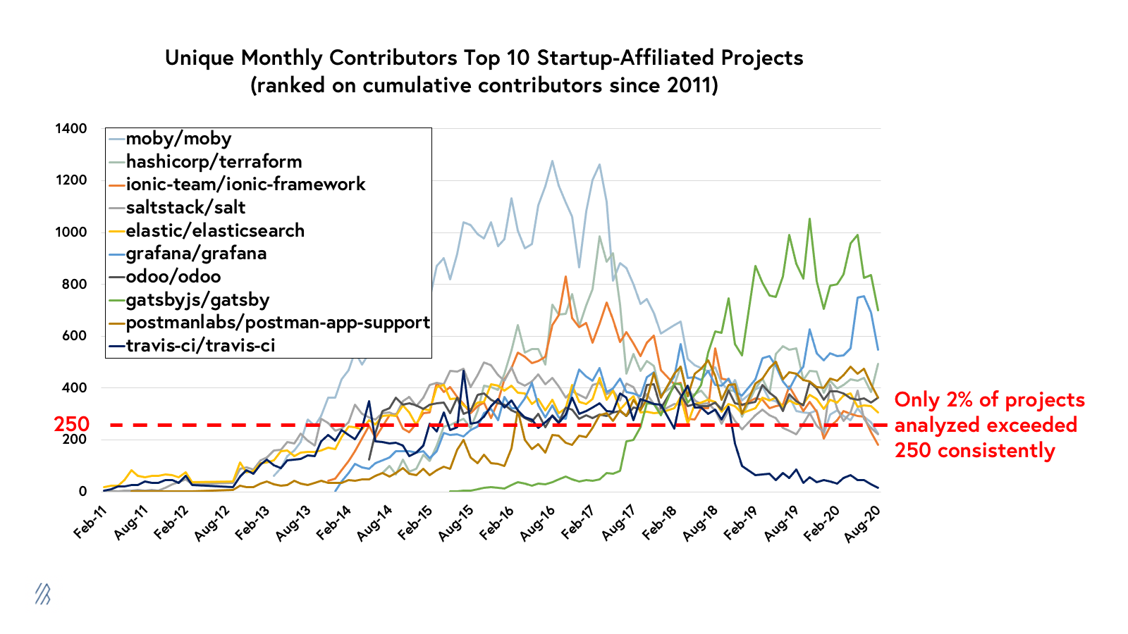 The Moby project (the underlying project behind Docker) and more recently Gatsby, are notable outliers on this chart in terms of peak engagement. But the rest of the projects tend to average between 200 and 600 monthly contributors, which is absolutely best-in-class. For context, out of the top 10,000 projects that we analyzed, less than 5% of those have ever exceeded 250 monthly contributors in a single month, and only 2% of projects ever exceeded 250 contributors consistently (in 6 or more months).