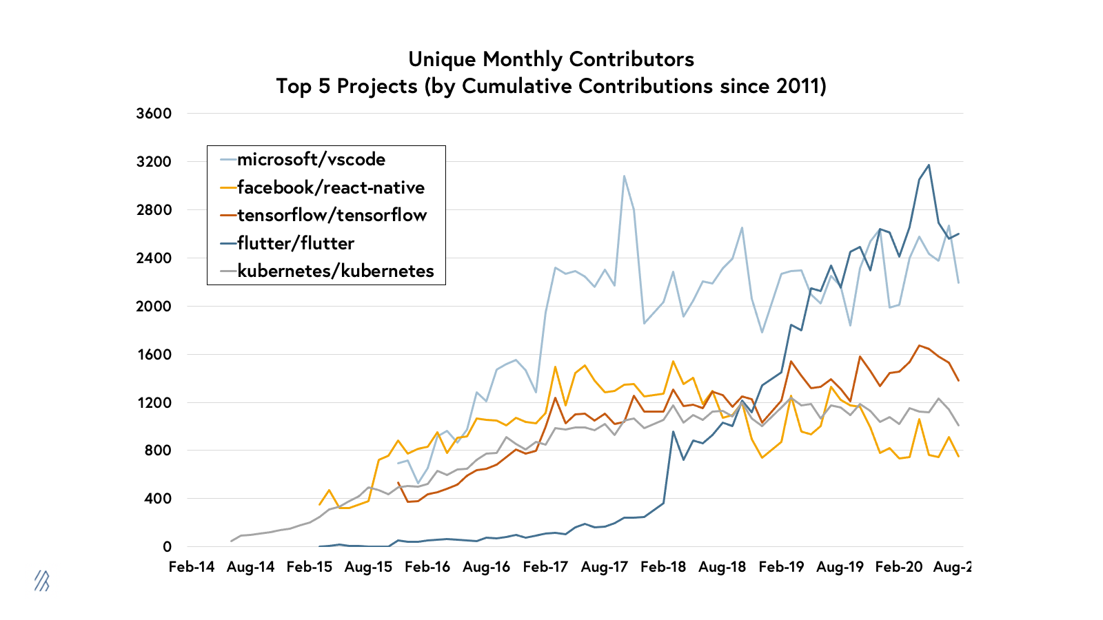 It’s impossible to discuss the largest OSS communities without running into projects from the tech giants. The top five open source projects of all time have come from Google, Microsoft and Facebook. These projects play a fundamental role in modern software development and cloud infrastructure, and they have built incredibly large communities, each reaching over 1,000 unique monthly contributors. Interestingly, each of these projects has become the top one or two most popular technologies in their respective categories, including VSCode, the widely used IDE, Kubernetes, the most popular container orchestration platform, and React Native and Flutter, the two most popular cross-platform frontend frameworks.