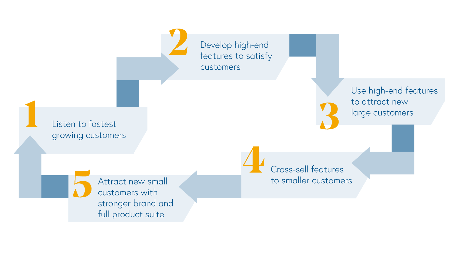 The steady ascent upmarket not only enlarges the TAM but allows the SaaS vendor to expand its core SMB customer segment. Winning larger, more recognizable customers contribute to a stronger brand that improves conversion and shortens sales cycles. As customers become more sophisticated over time, they too will want the high-end features and modules originally developed for larger customers. This provides not only the ability to upsell and cross-sell more efficiently, but it also removes any cause for churn as the startup’s smaller customers grow.