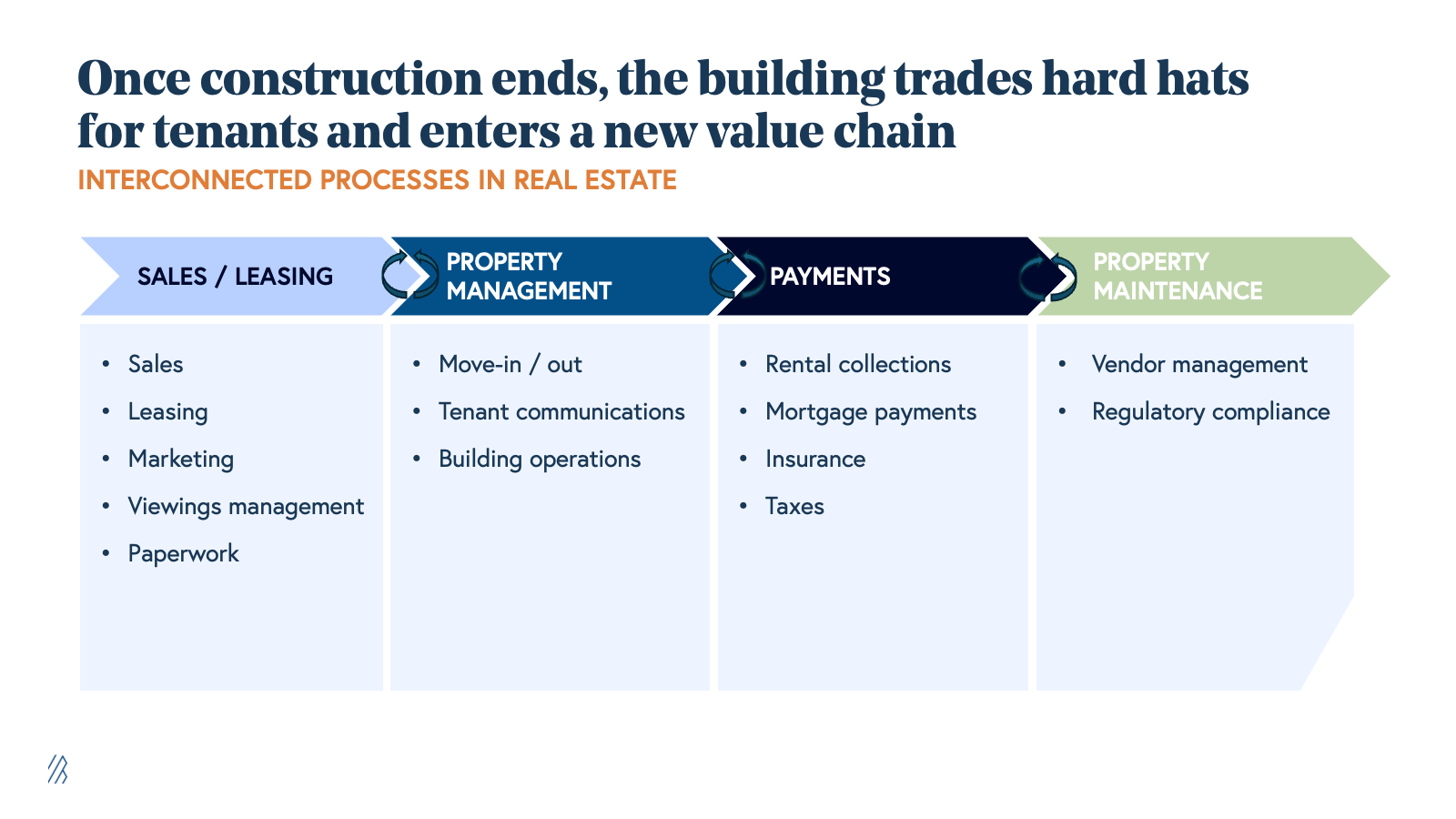 Once construction ends, the building trades hard hats for tenants and enters a new value chain, which spans sales, leasing, payments, property management, and maintenance. While this value chain varies across asset types (residential, commercial, industrial, and special-purpose), all share one foundation: real estate is a trust-driven business where local knowledge, networks, and relationships define success.