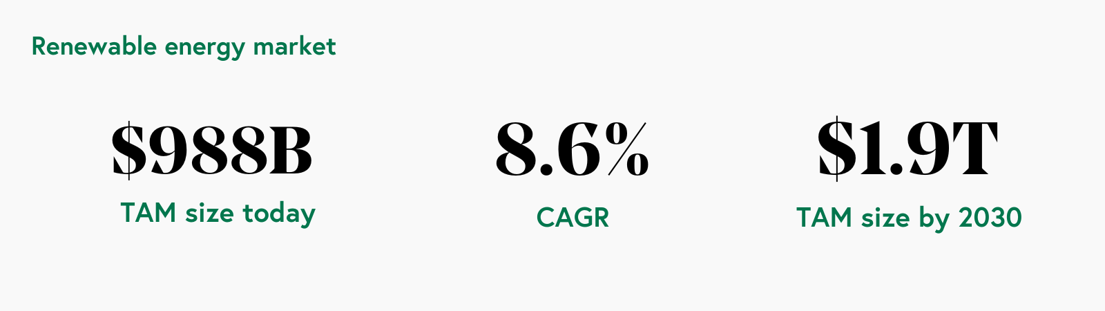 The renewable energy market size is $988.26B in 2022, growing at a CAGR of 8.6%, and expecting to scale to $1,912.12B by 2030. The transition from fossil fuels to clean energy generation and electrification will be one of the largest wealth transitions of our lifetime, and capturing even a sliver of this market with enabling software represents a massive TAM opportunity with room for rapid growth as the industry matures.