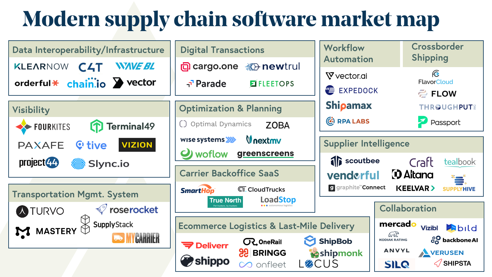 Just as we’ve seen the rise of vertical software giants, such as Toast, Procore, ServiceTitan, etc. revolutionize other industries with cloud-enabled solutions, the supply chain and logistics sector is entering an auspicious time where entirely new categories of software will come to market.