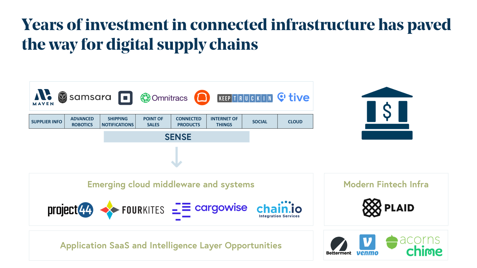 In addition, while supply chain data had traditionally been stored in on-premise systems that were difficult to access or integrate with, over the past few years we have seen the emergence of cloud-based systems of record like Cargowise, and data aggregators like Project44 and FourKites, which are making it easier than ever before to build modern software applications that leverage this data. As a result, we see the opportunity for new categories of intelligence and application-layer SaaS companies to be built on top of these digital middleware layers.