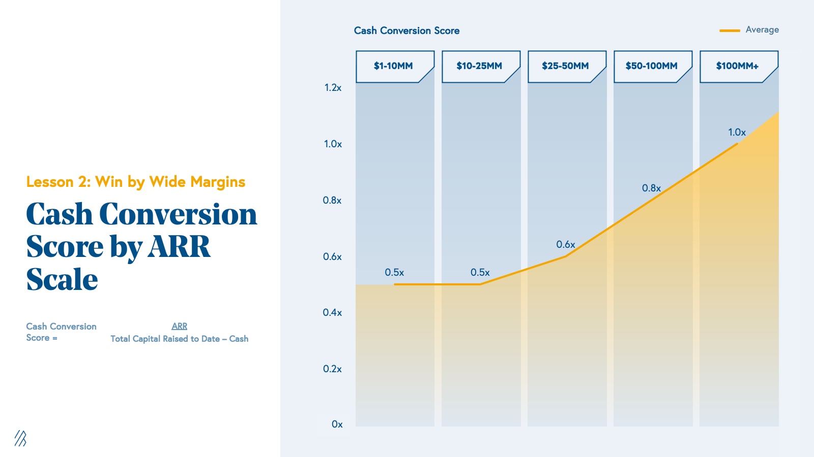 The average Cash Conversion Score for cloud companies tends to increase as it matures, from an average of almost 0.5x from $1-10MM of ARR to almost 1x at $100MM+. For cloud companies, revenue generation tends to lag spending and only the strongest companies will scale to the $100MM+ mark where they are seeing the most leverage from their operating model.