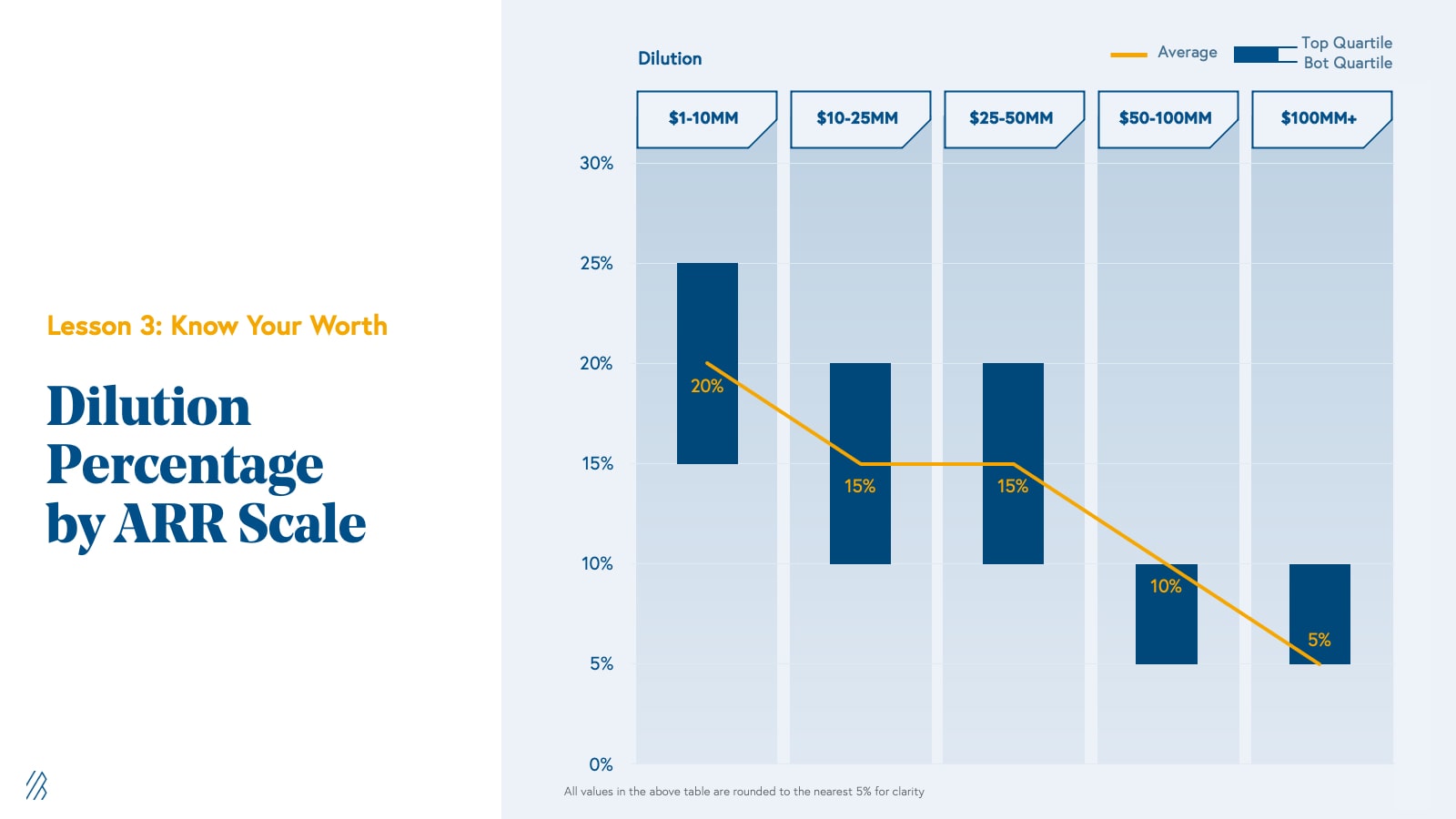 Round size is the other major lever that cloud companies can toggle when structuring a fundraise. Knowing how much to raise at each stage of growth while balancing the tradeoff of dilution and runway is a tension that you will likely have to grapple with.