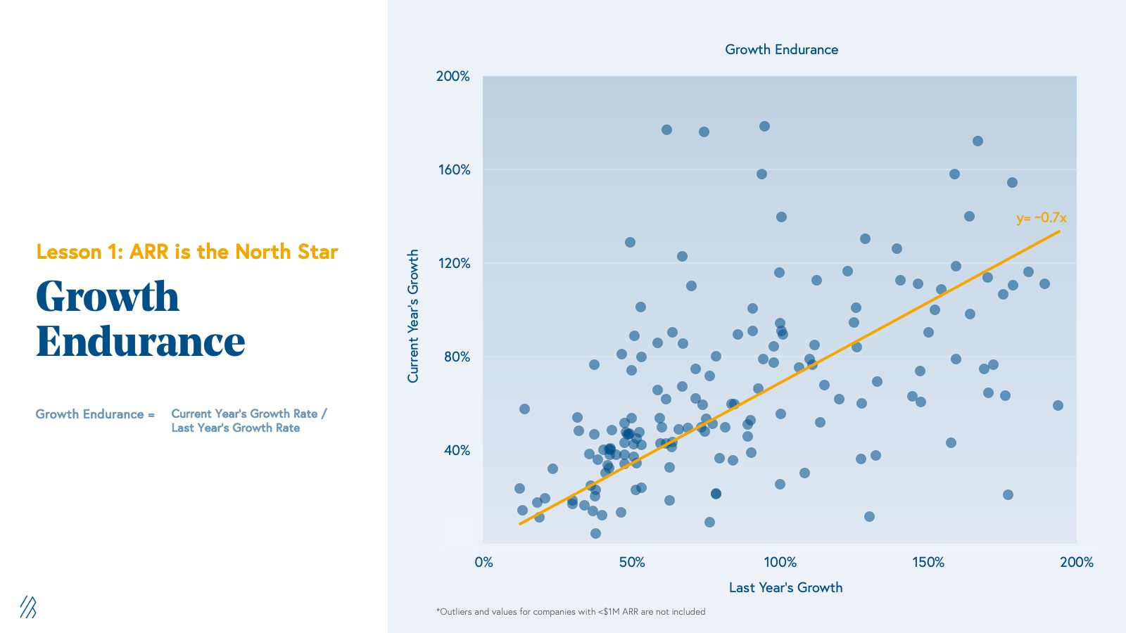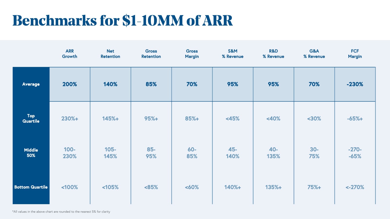 • Typical growth: ~200% at $1–10MM ARR, decreasing to 60% over $100MM.