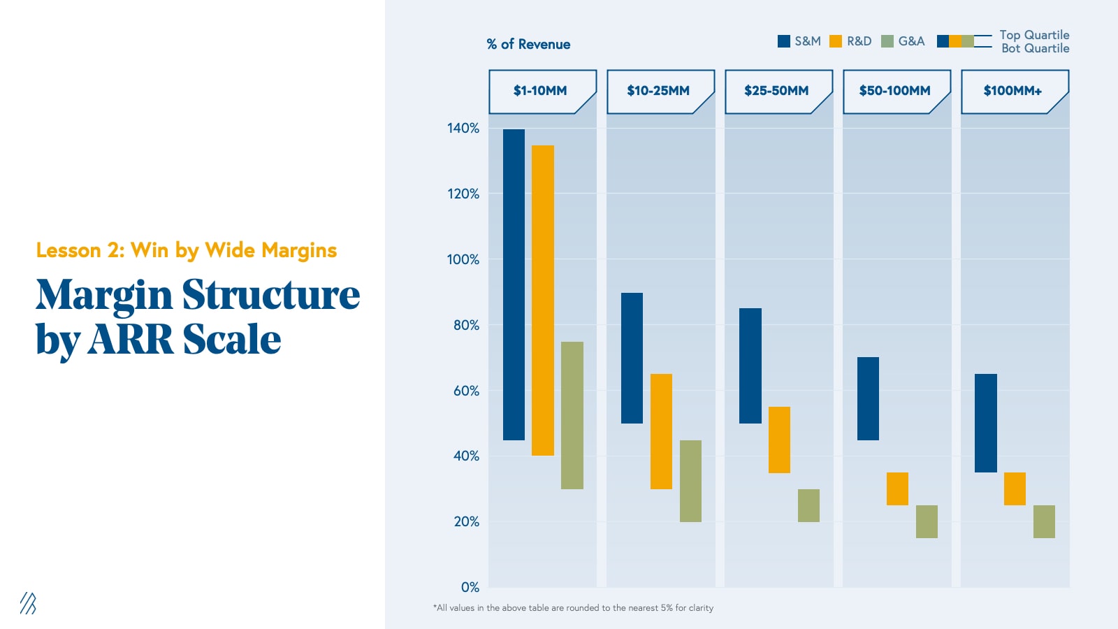 • At $100MM ARR: the averages of R&D are 35%, S&M 50%, and G&A 20% of revenue.
