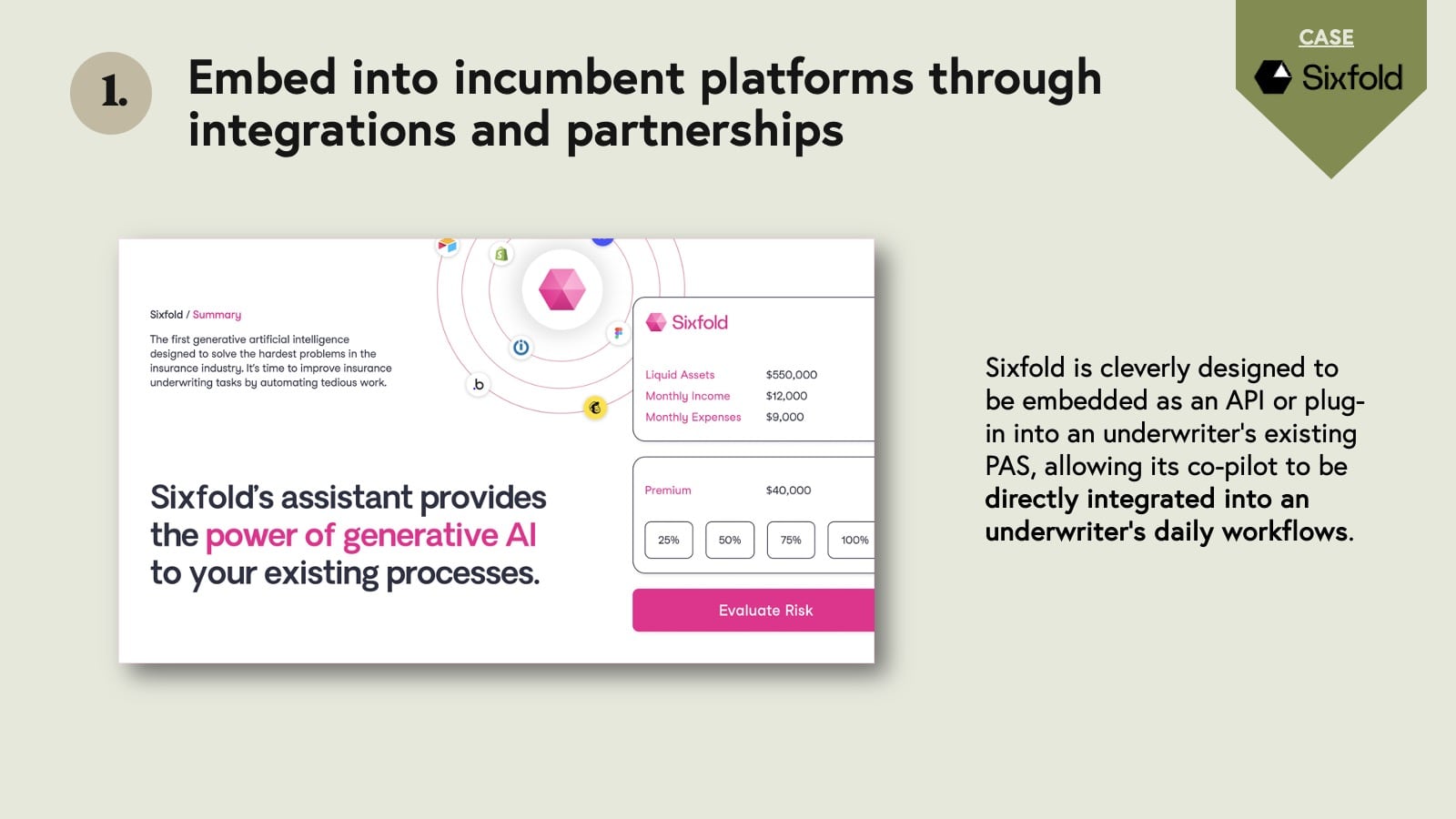 Bessemer portfolio company Sixfold – a leader in generative AI for insurance underwriters designed to boost underwriting capacity, accuracy, and transparency -- is a role model on this front. Underwriters typically work in Policy Administration Systems (PAS), which help them rate, quote, and bind insurance policies with insurance agents. Sixfold is cleverly designed to be embedded as an API or plug-in into an underwriter’s existing PAS, such that insurers do not need to overhaul legacy systems or replatform their workbench in order to interact with Sixfold’s co-pilot. Consequently, underwriters can experience the power of Sixfold’s AI very effortlessly since Sixfold is seamlessly integrated into existing daily workflows.